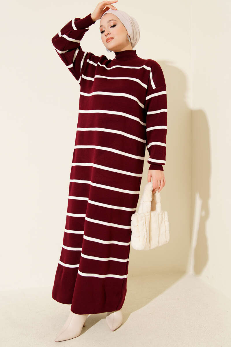 Bisiklet Yaka Fitilli Triko Elbise Bordo