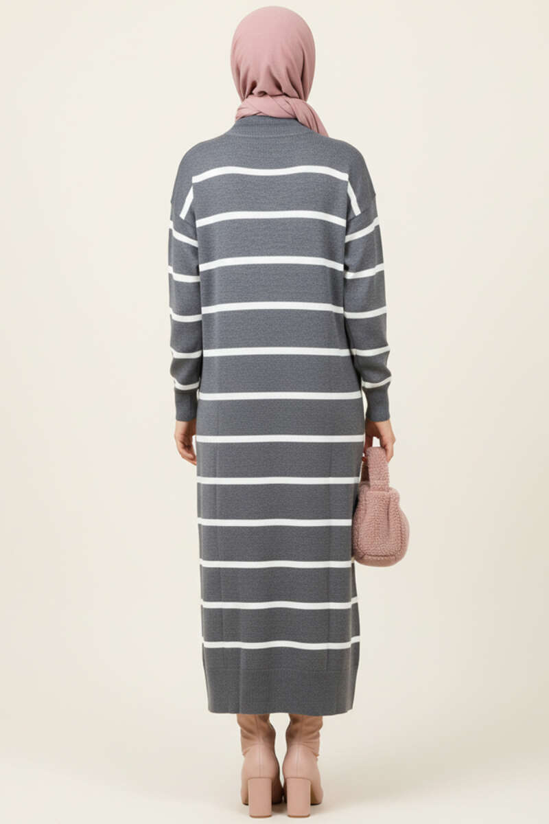 Yatay Çizgili Balıkçı Yaka Triko Elbise Taş