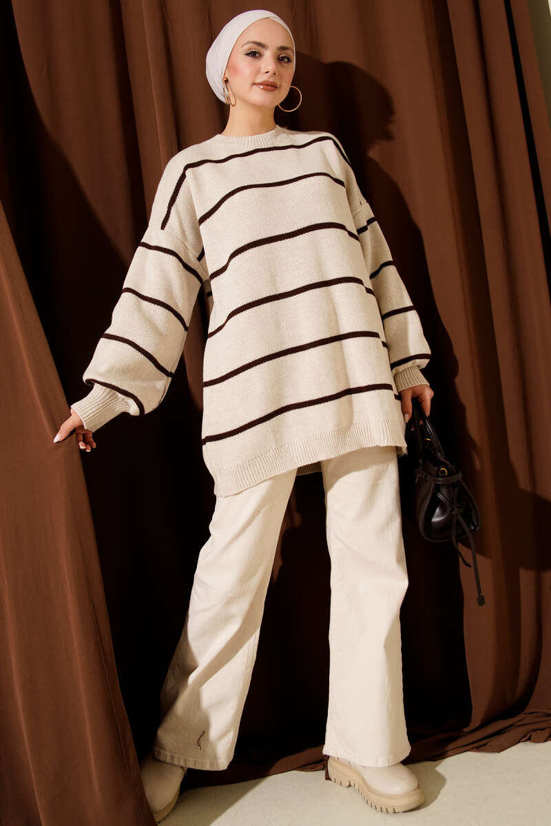 Yatay Çizgili Balon Kol Triko Tunik Bej