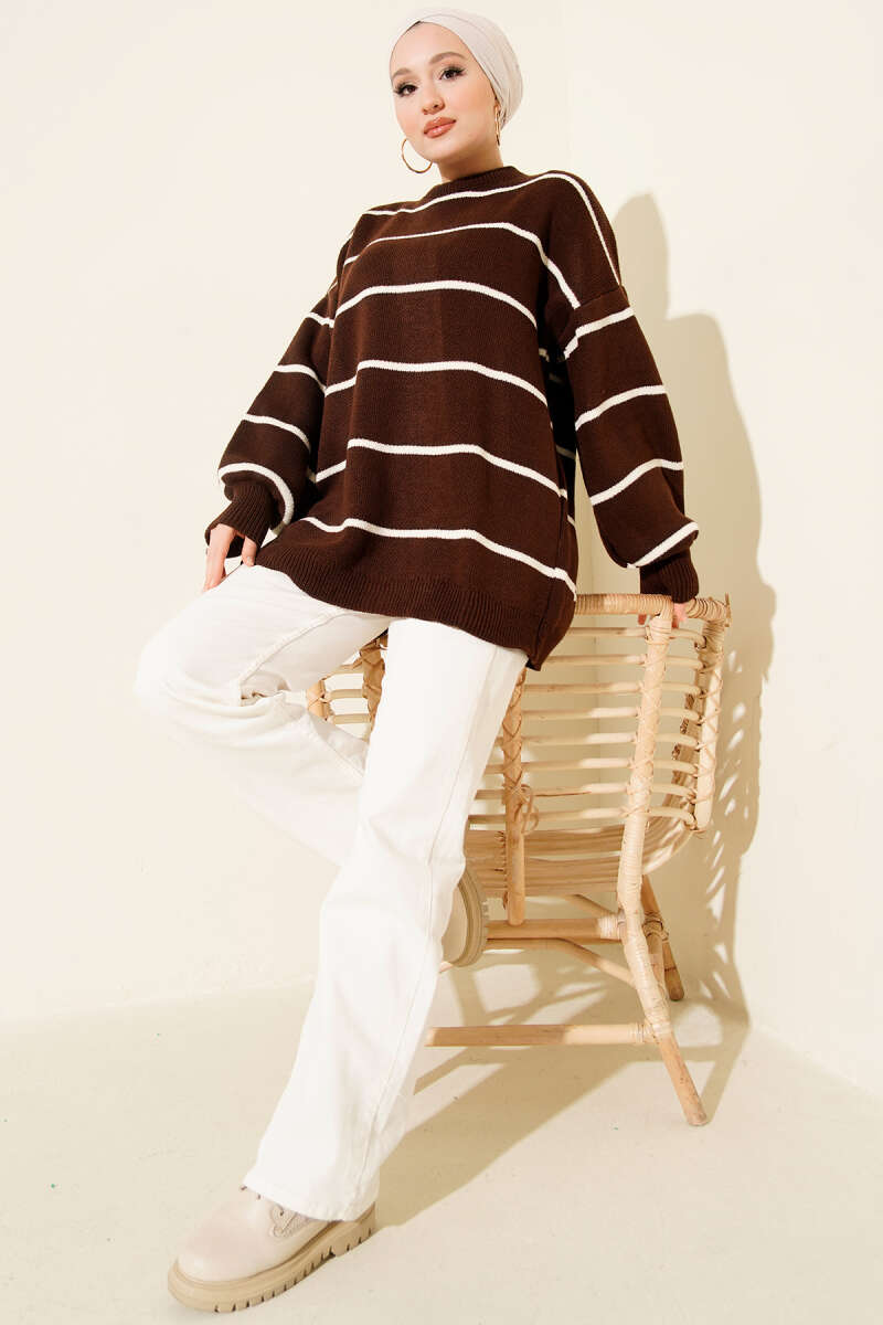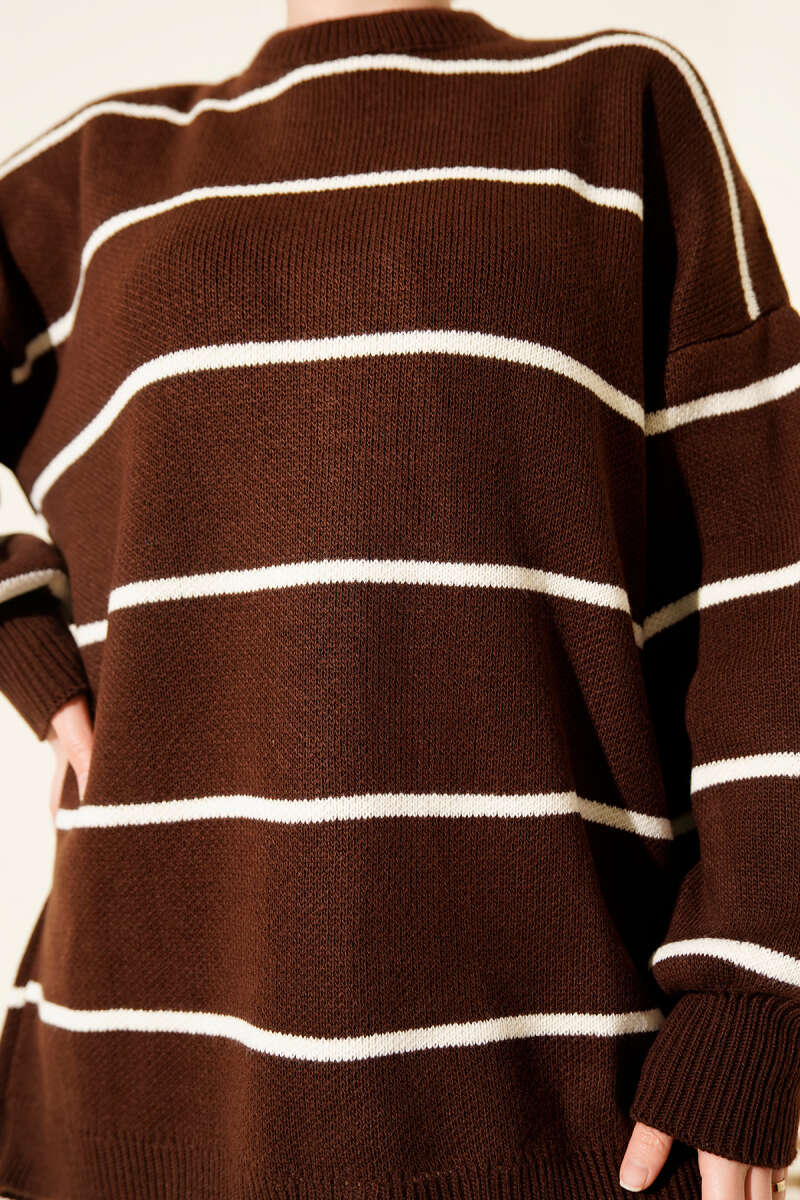Yatay Çizgili Balon Kol Triko Tunik Kahve