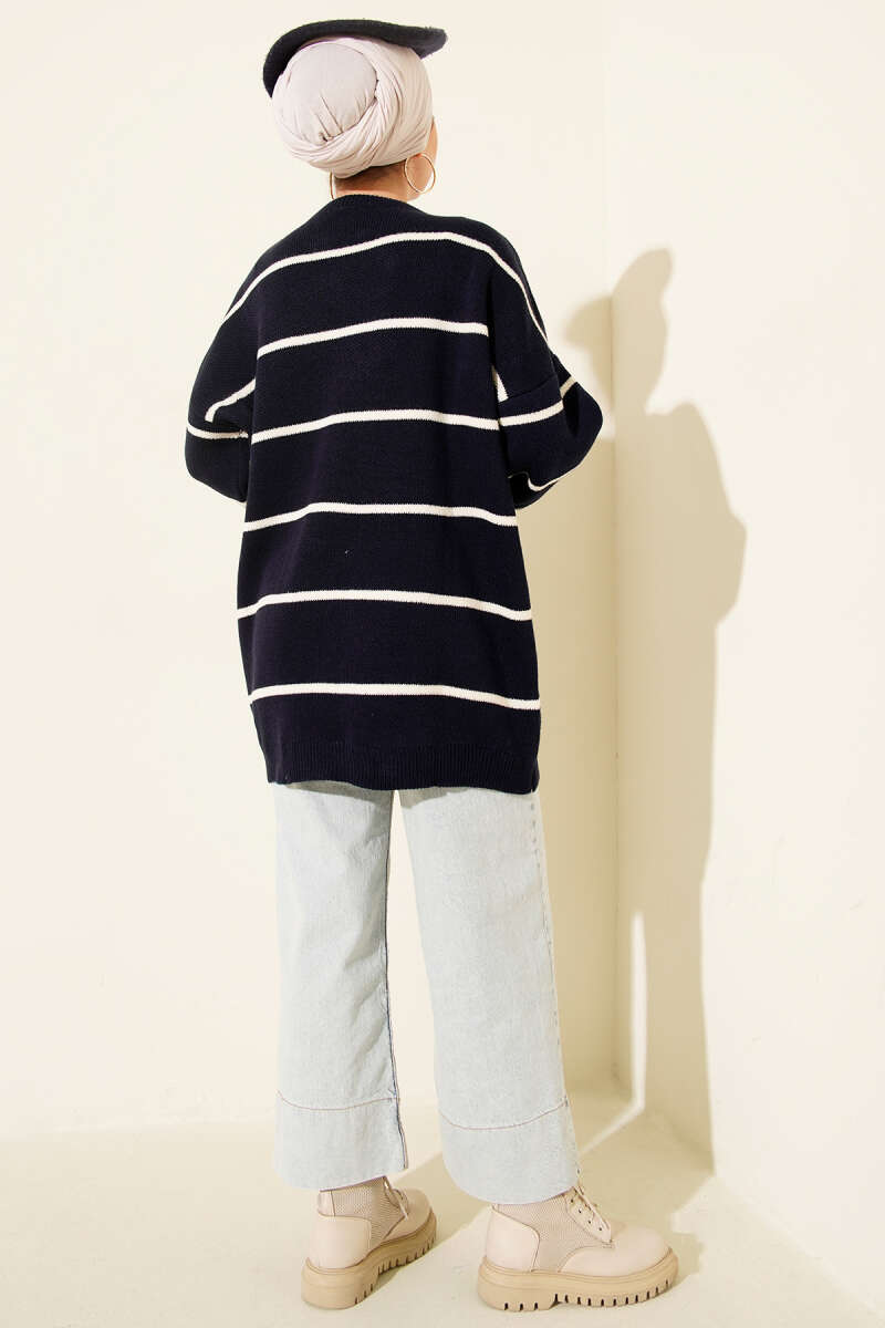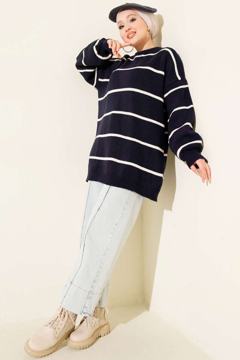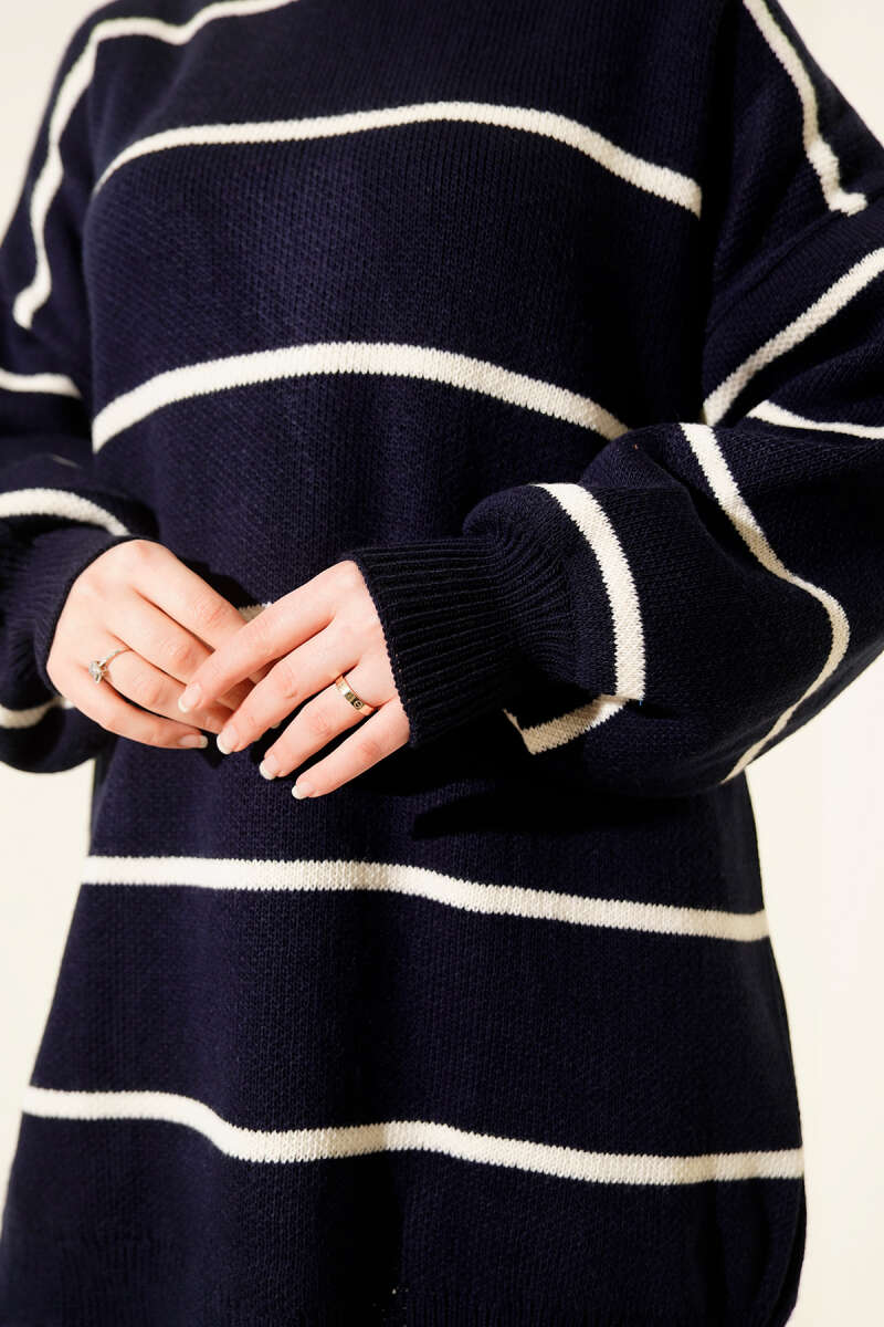 Yatay Çizgili Balon Kol Triko Tunik Lacivert