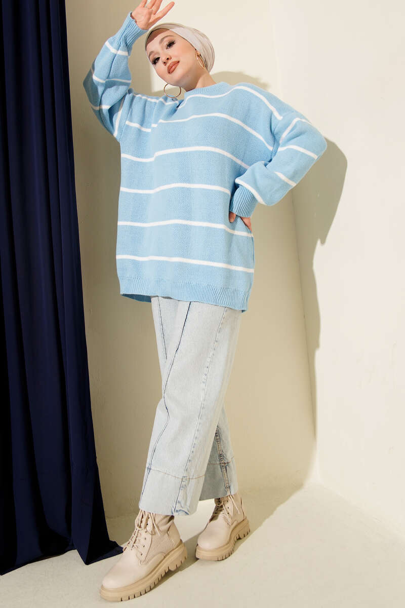 Yatay Çizgili Balon Kol Triko Tunik Mavi