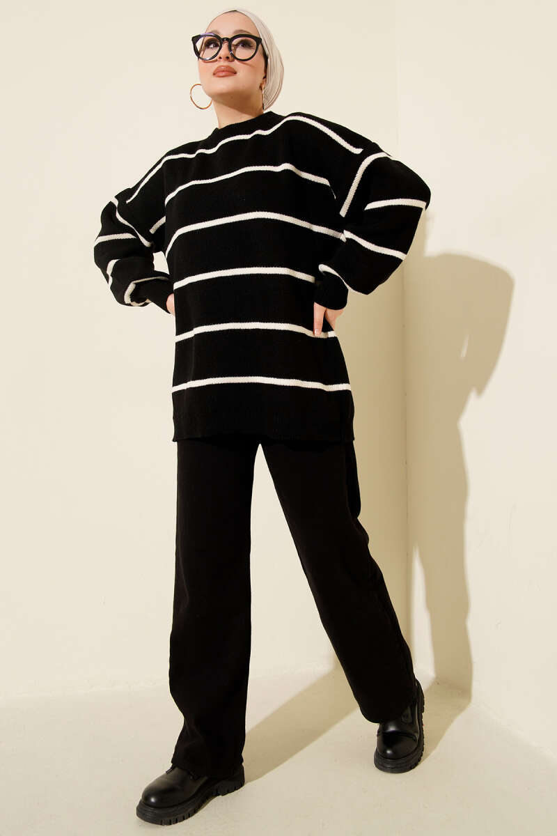 Yatay Çizgili Balon Kol Triko Tunik Kahve