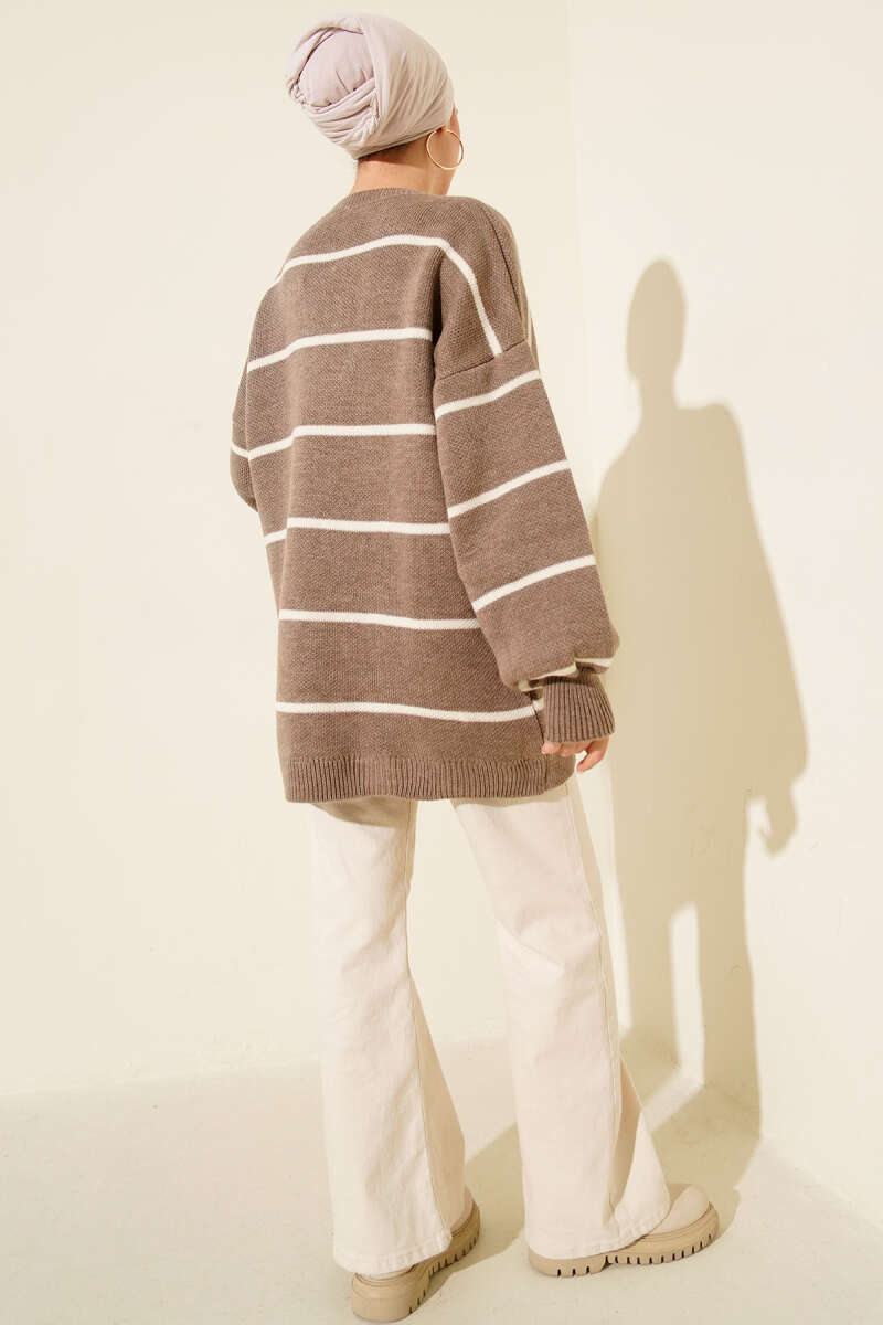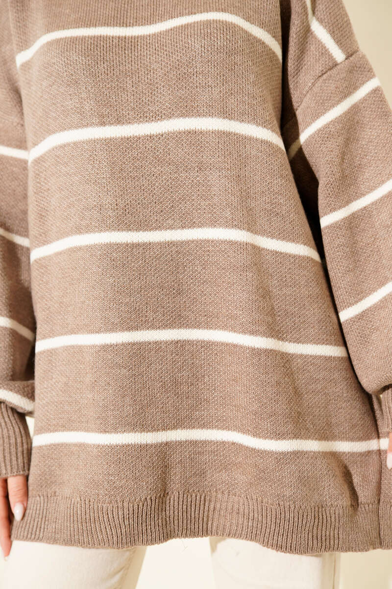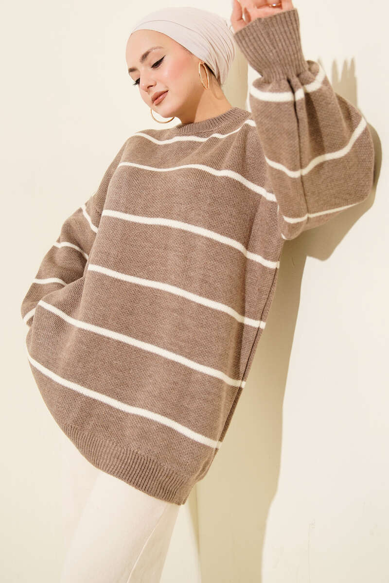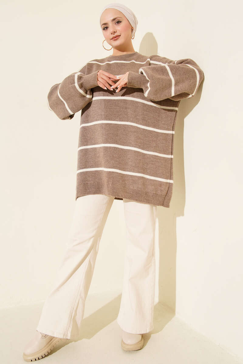 Yatay Çizgili Balon Kol Triko Tunik Vizon