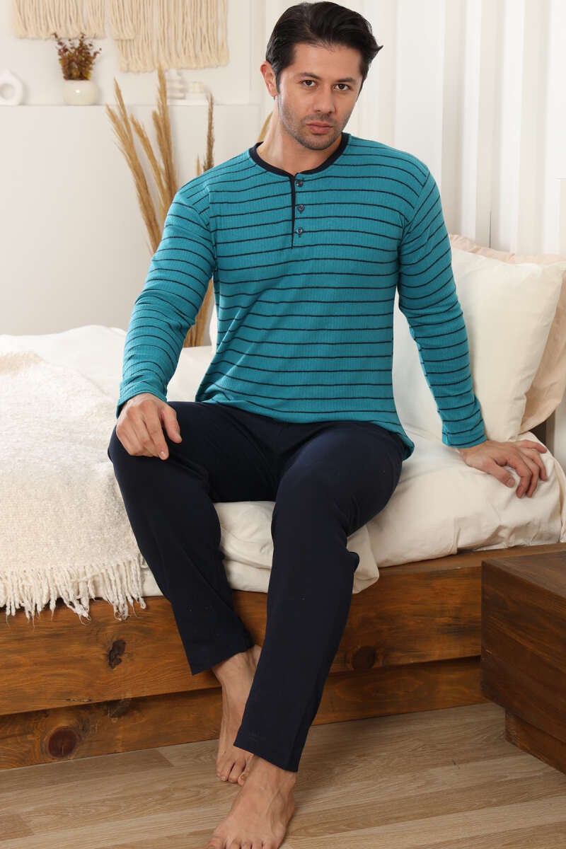 Yatay Çizgili Düğme Detaylı Erkek Pijama Takımı Petrol