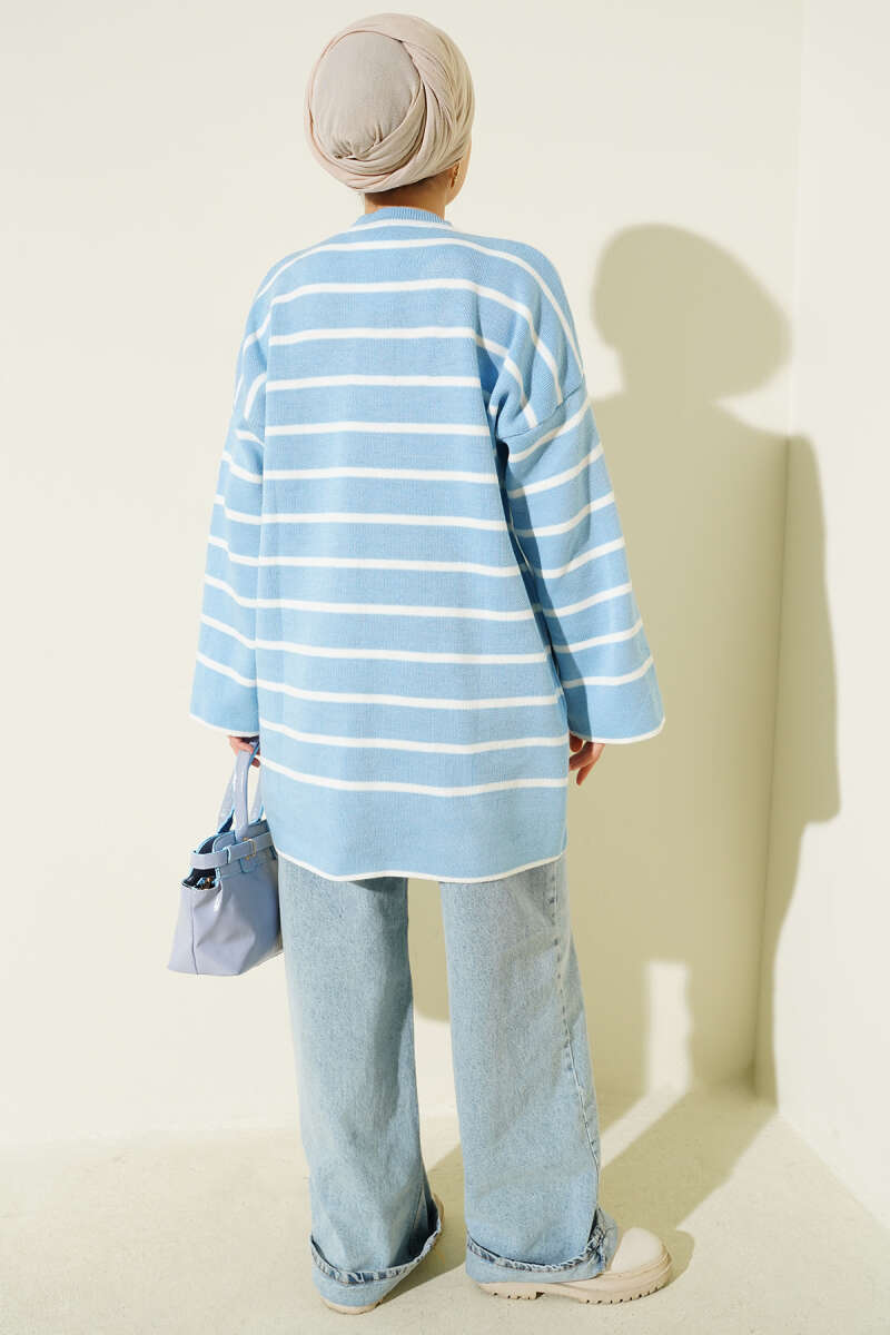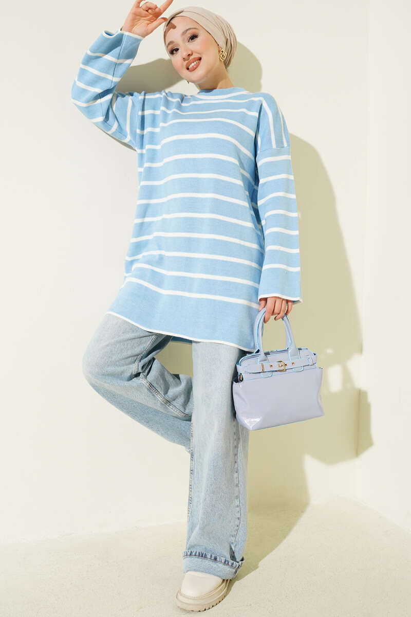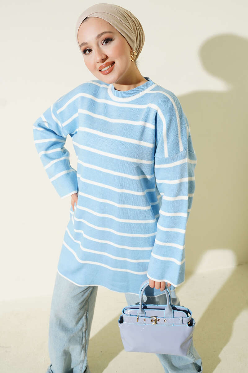 Yatay Çizgili Düşük Omuz Triko Tunik Oranj