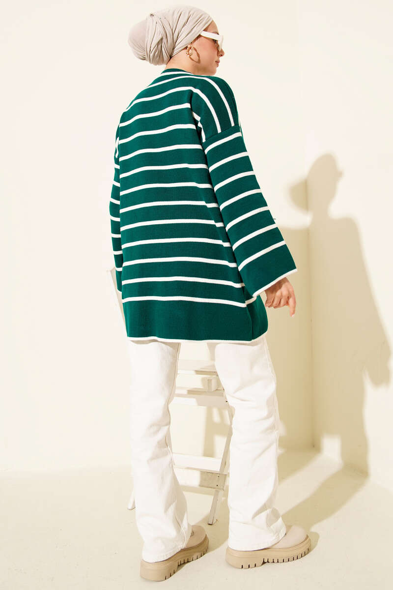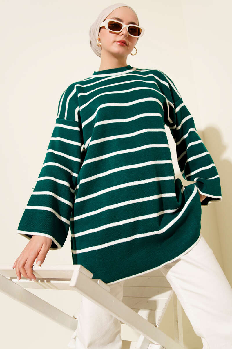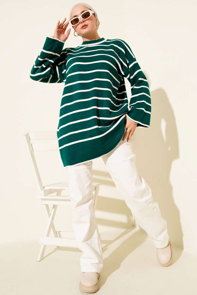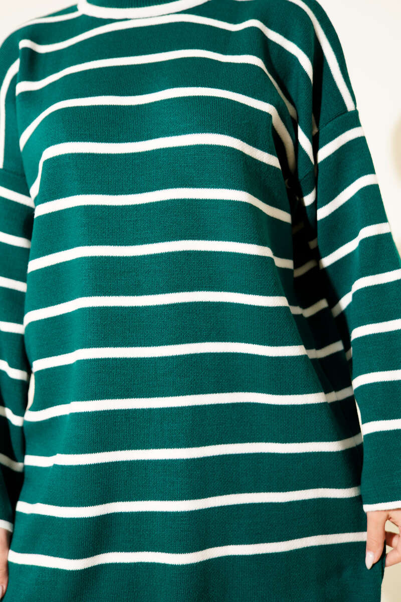 Yatay Çizgili Düşük Omuz Triko Tunik Taş