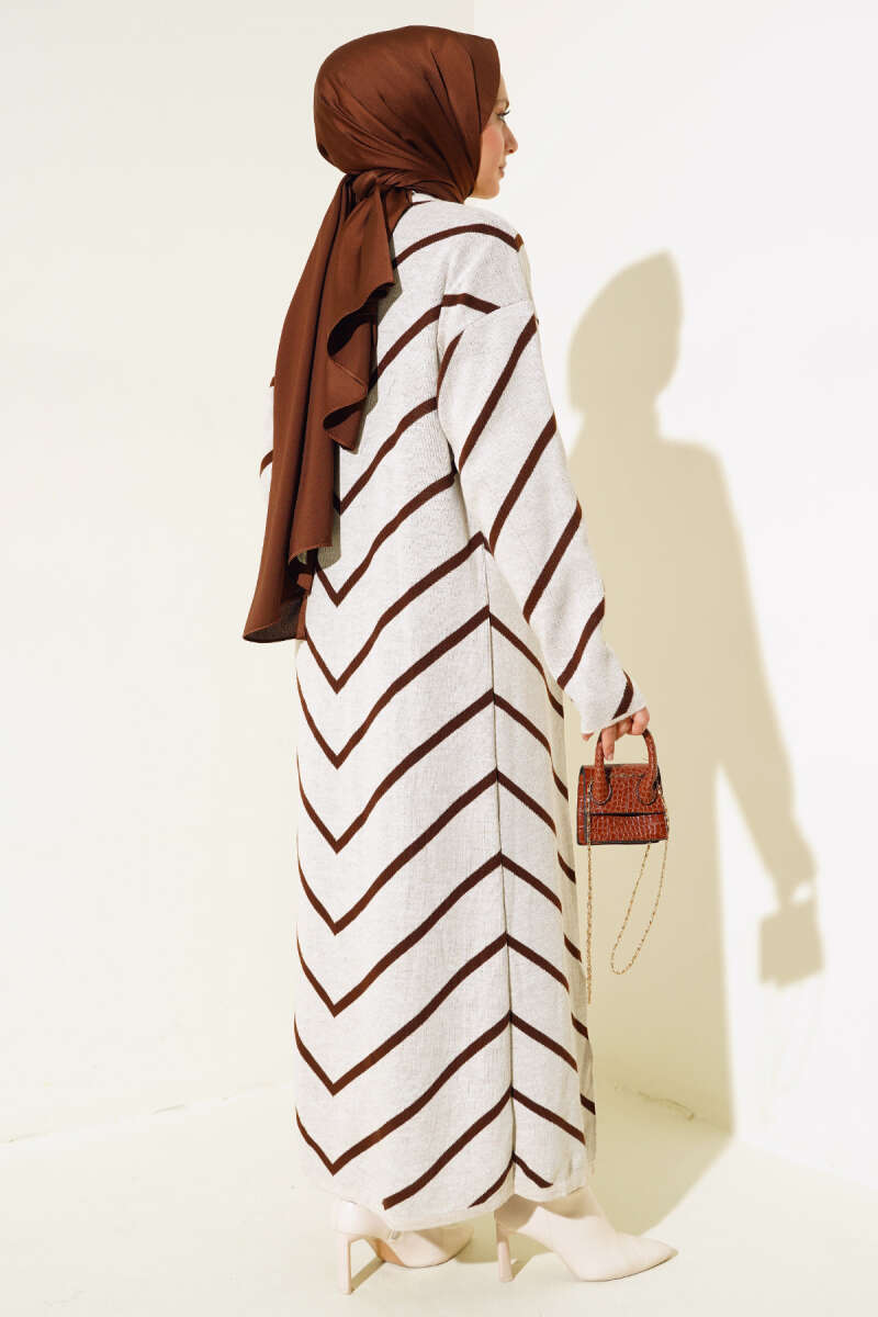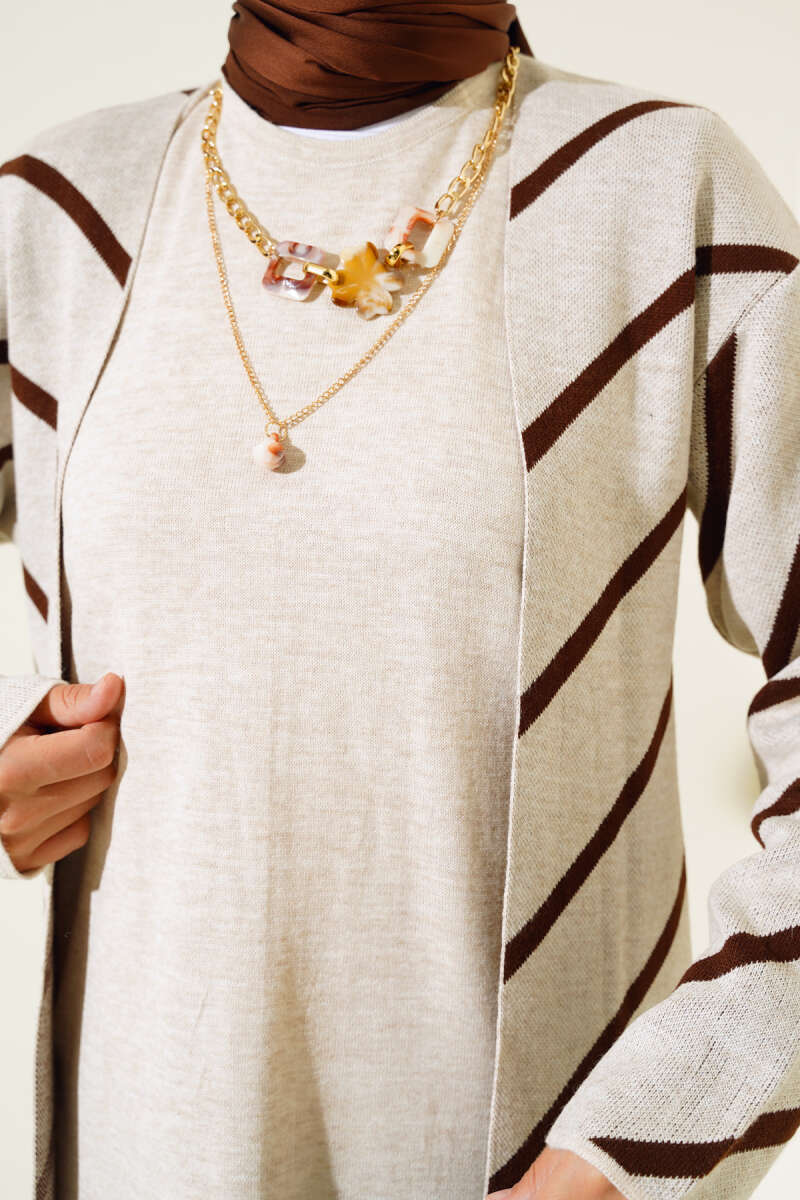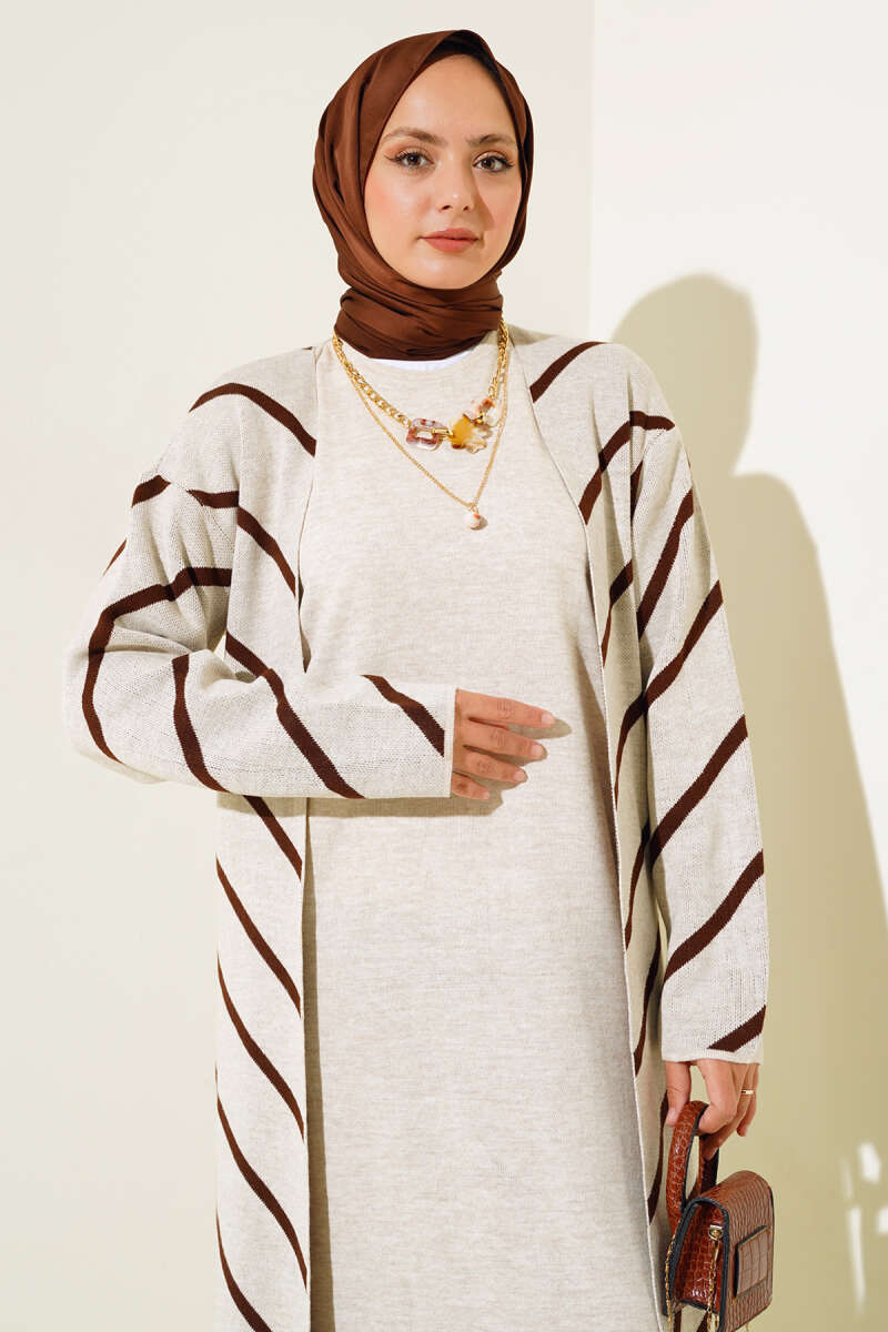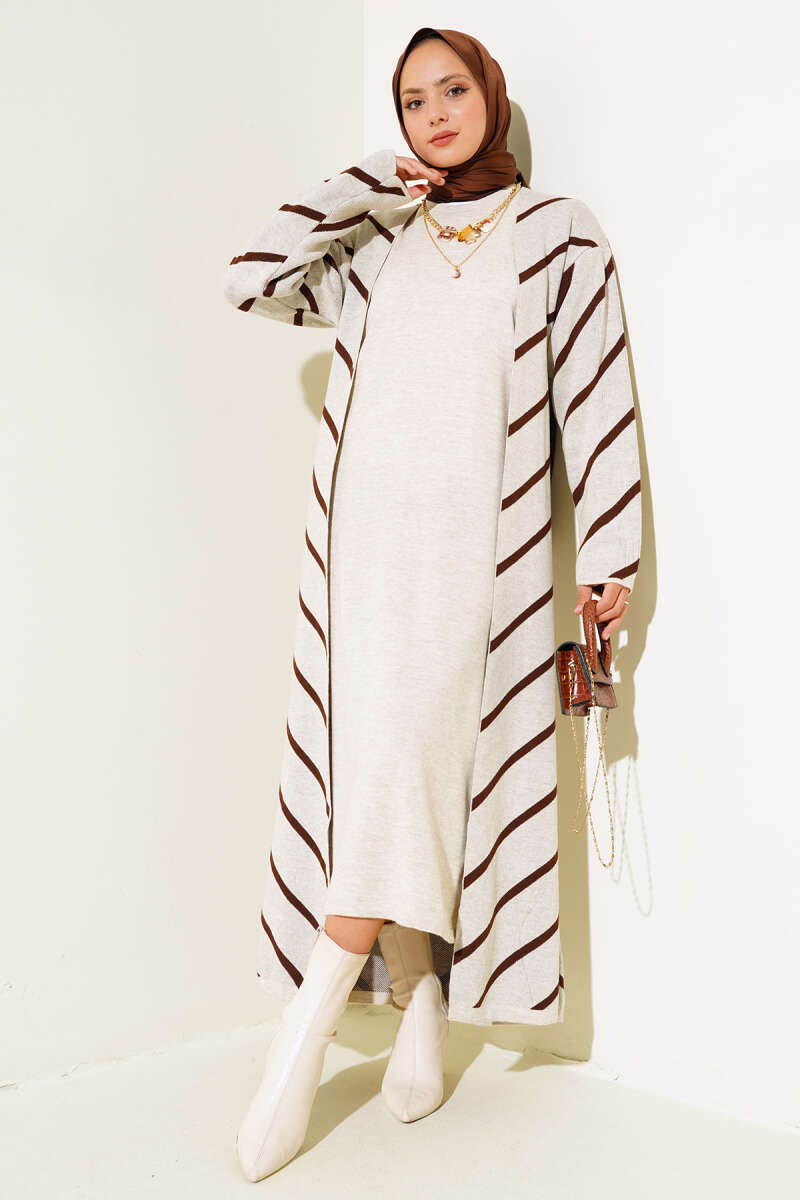 Yatay Çizgili Elbise Triko İkili Takım Kahve