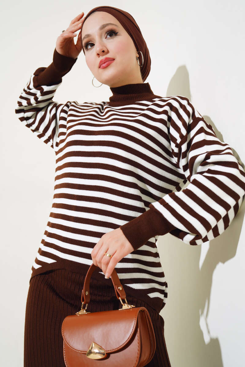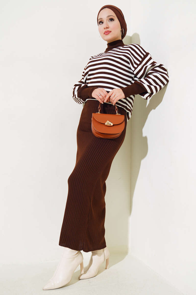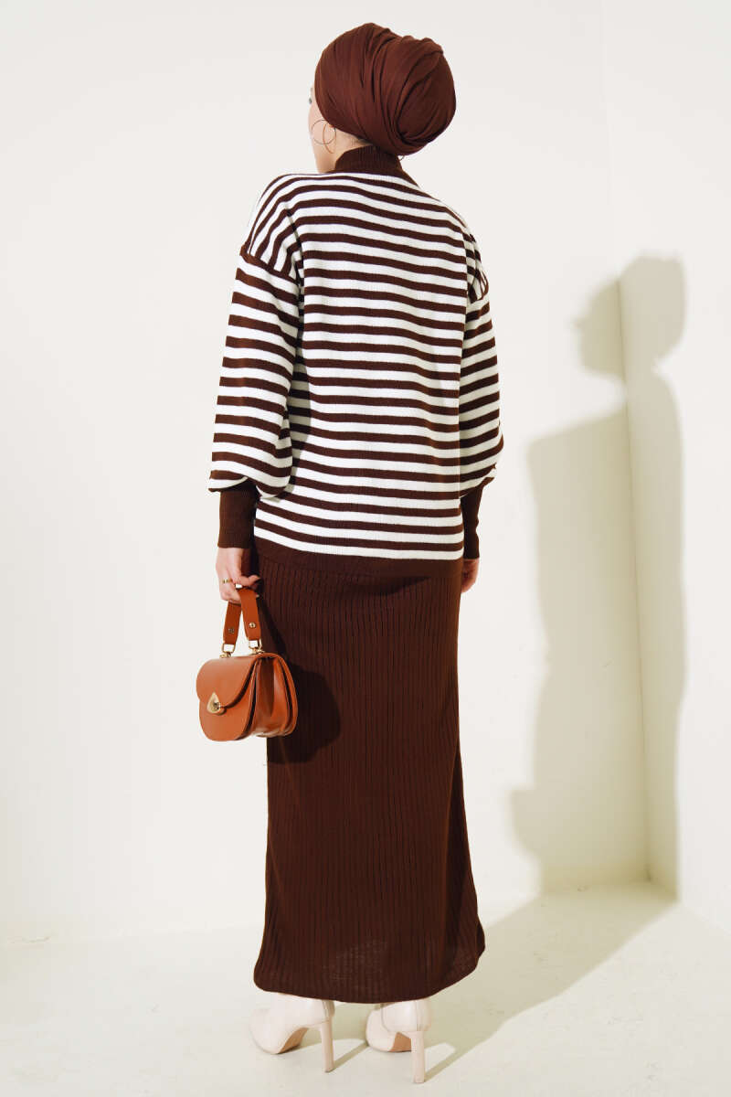Yatay Çizgili Elbise Triko Takım Kahve