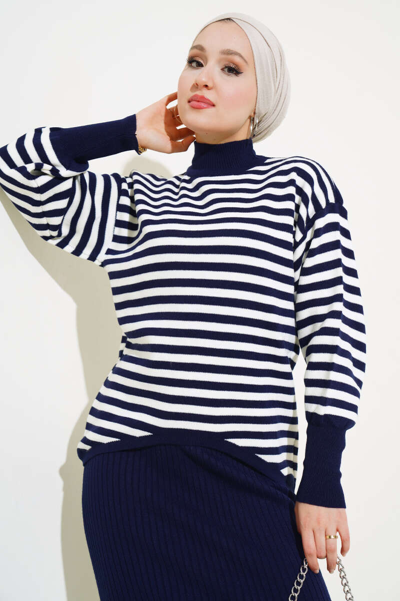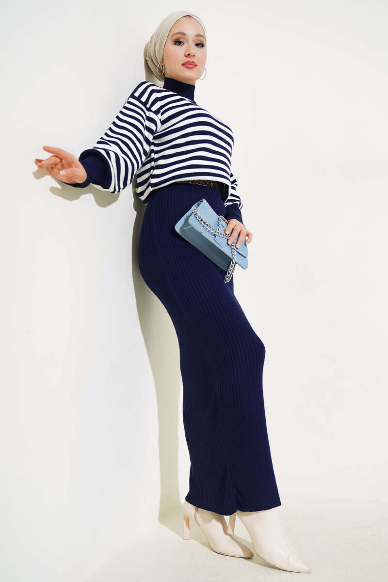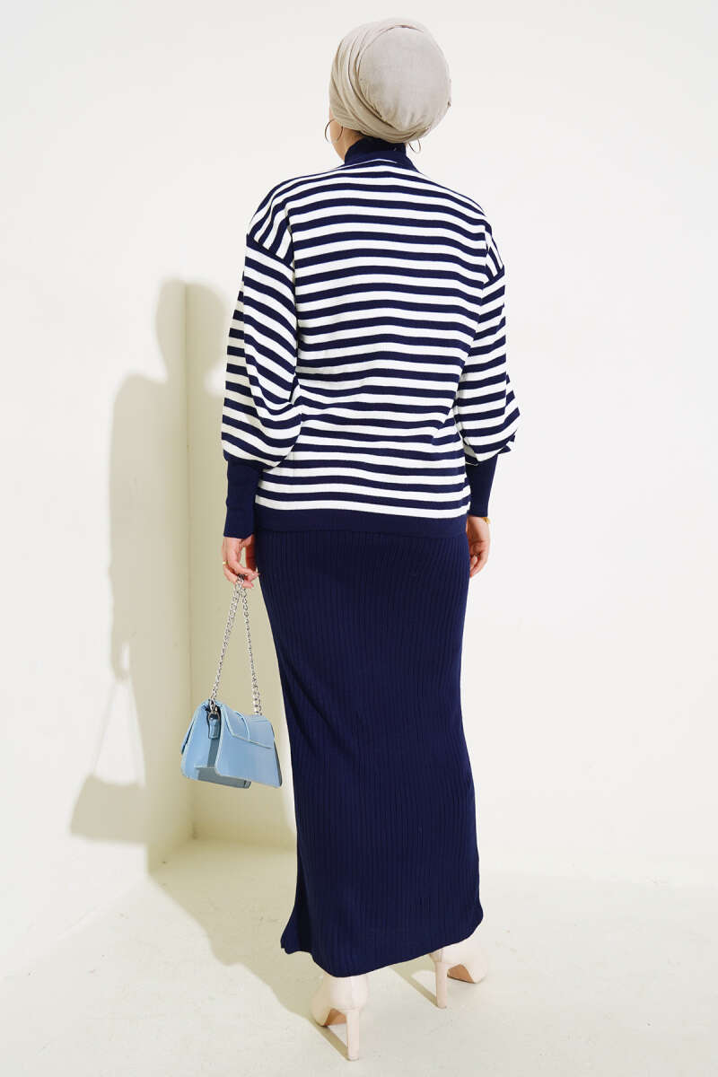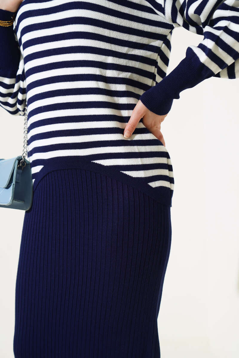 Yatay Çizgili Elbise Triko Takım Lacivert