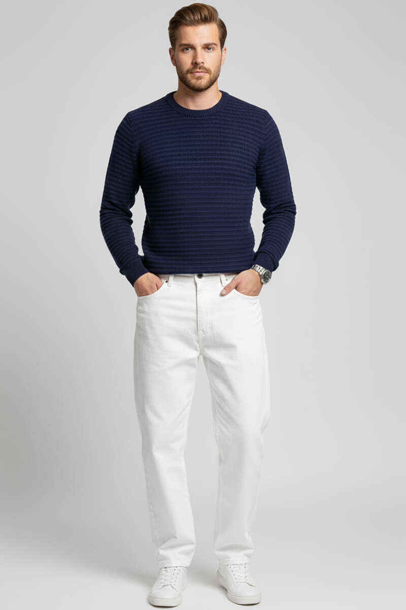 Polo Yaka Çizgi Detaylı Erkek Kazak Beyaz