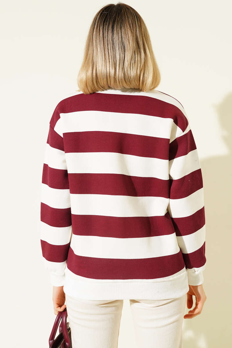 Yatay Çizgili Fermuarlı Üç İplik Sweatshirt Bordo