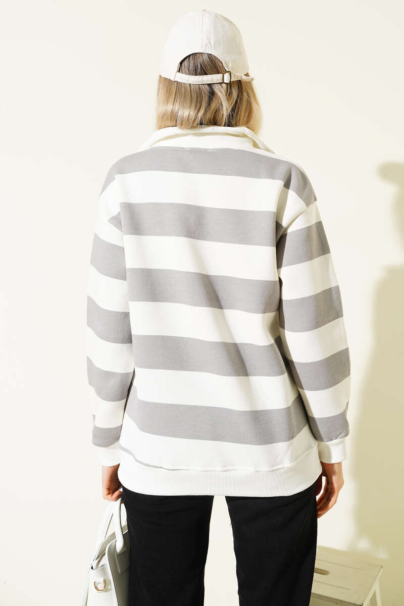Yatay Çizgili Fermuarlı Üç İplik Sweatshirt Füme