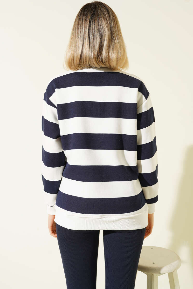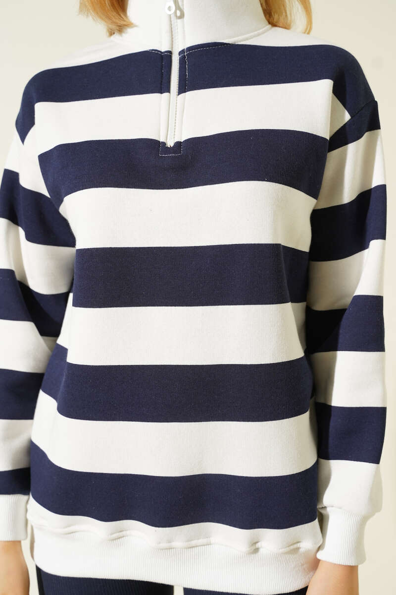Yatay Çizgili Fermuarlı Üç İplik Sweatshirt Füme