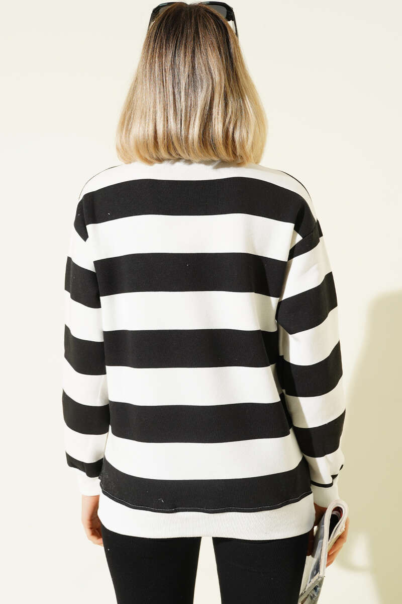 Yatay Çizgili Fermuarlı Üç İplik Sweatshirt Siyah