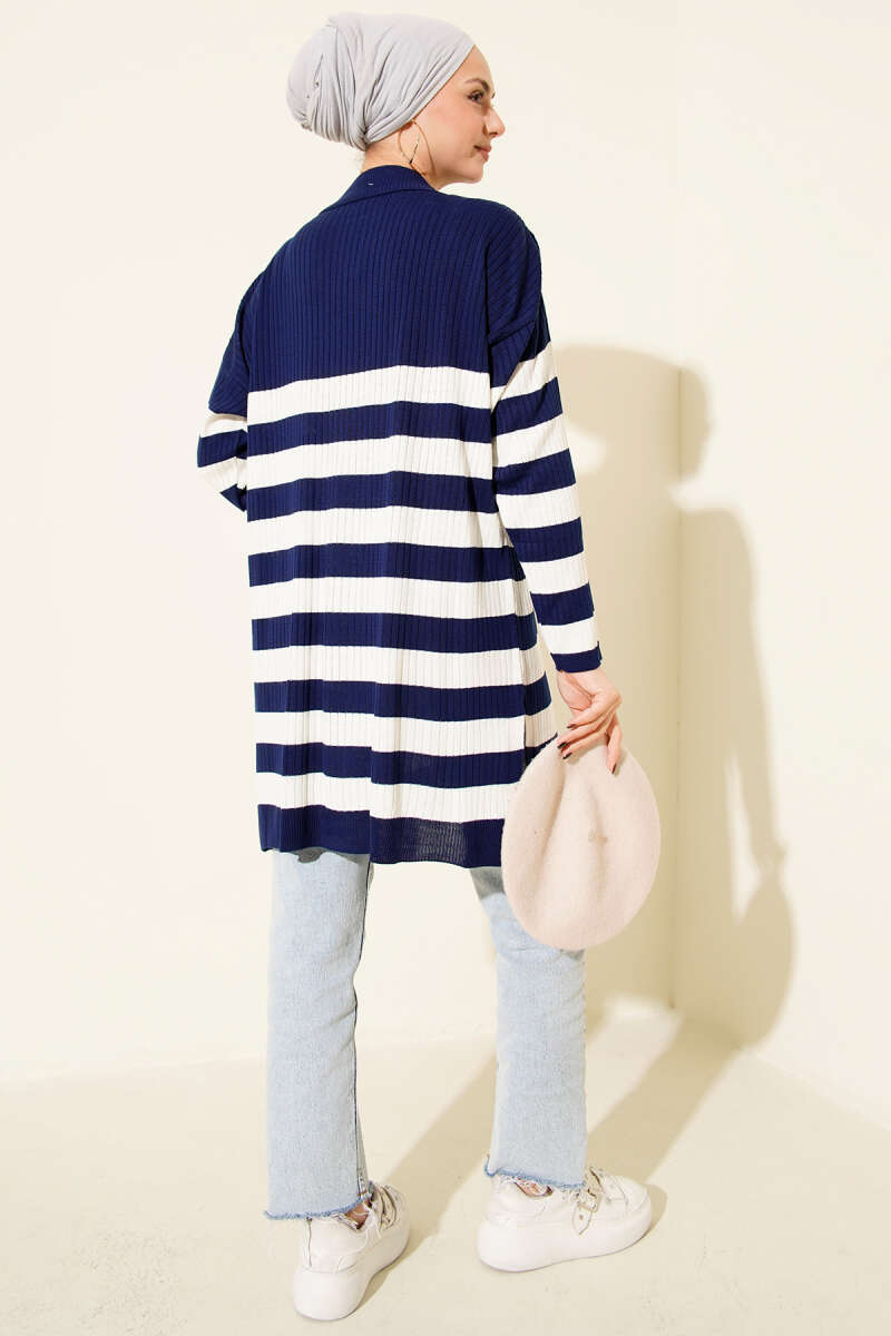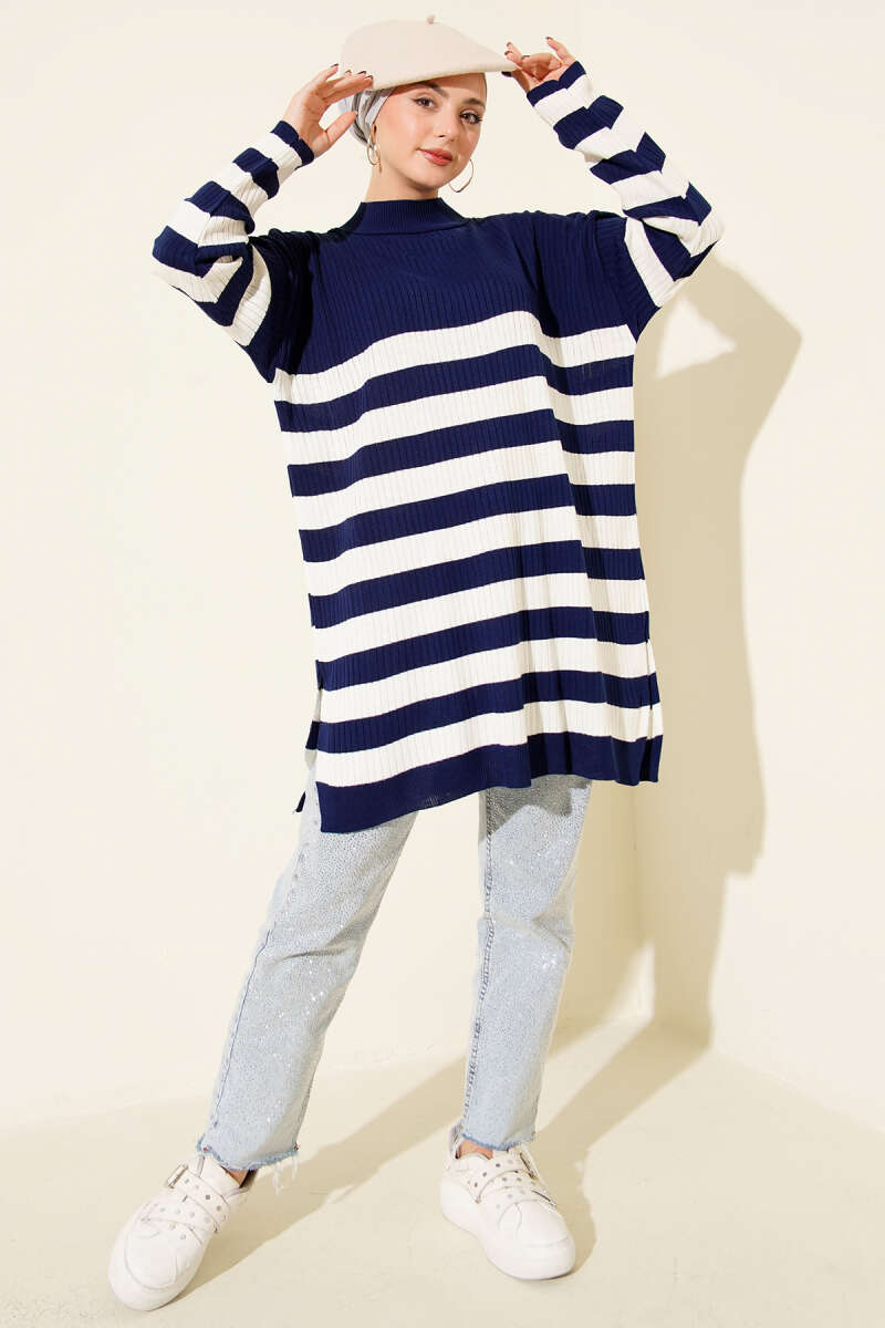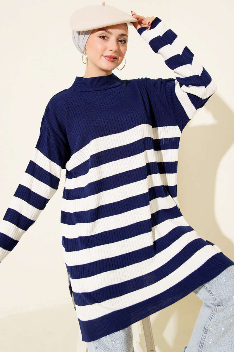 Yatay Çizgili Fitilli Triko Tunik Vizon