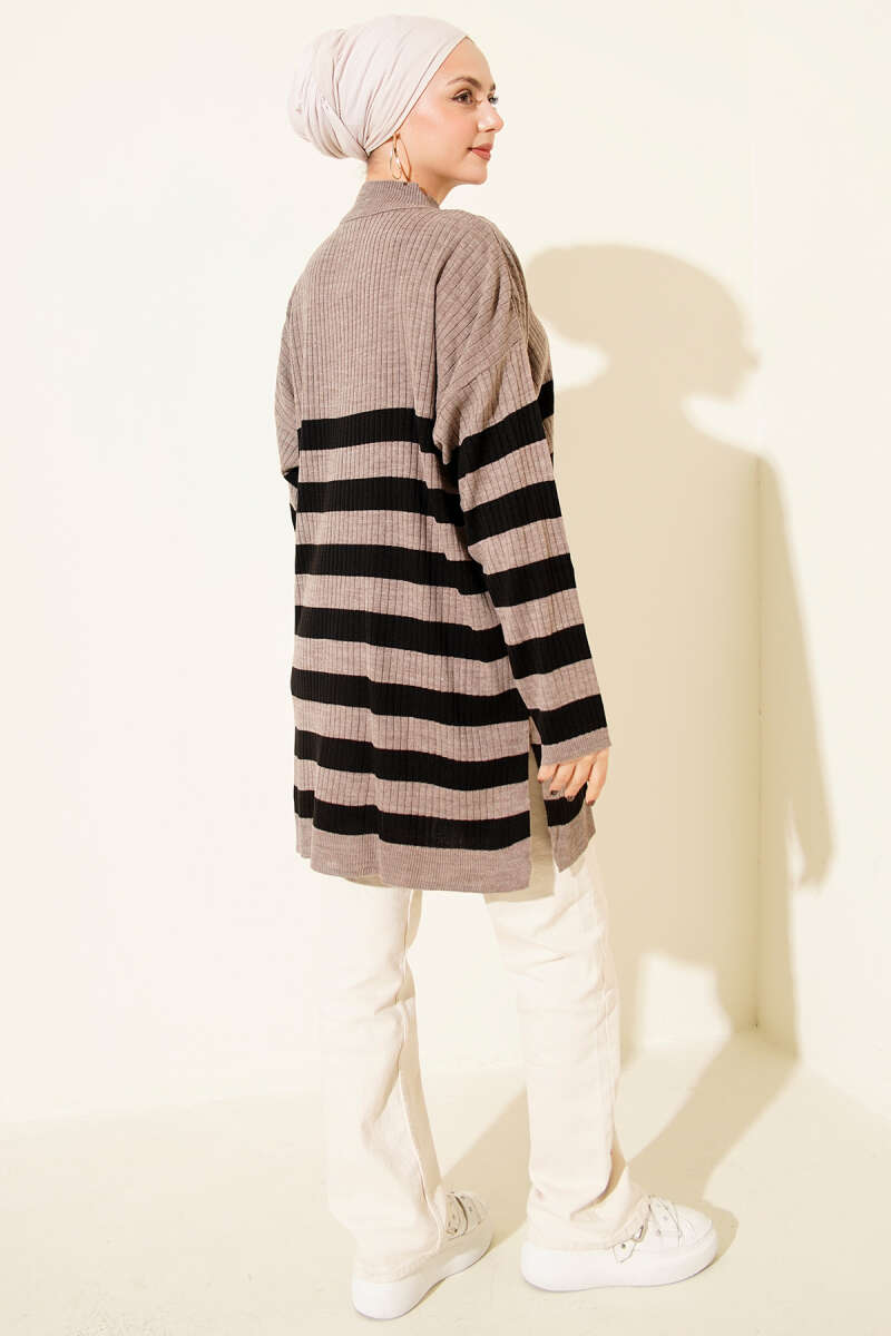Yatay Çizgili Fitilli Triko Tunik Kahve