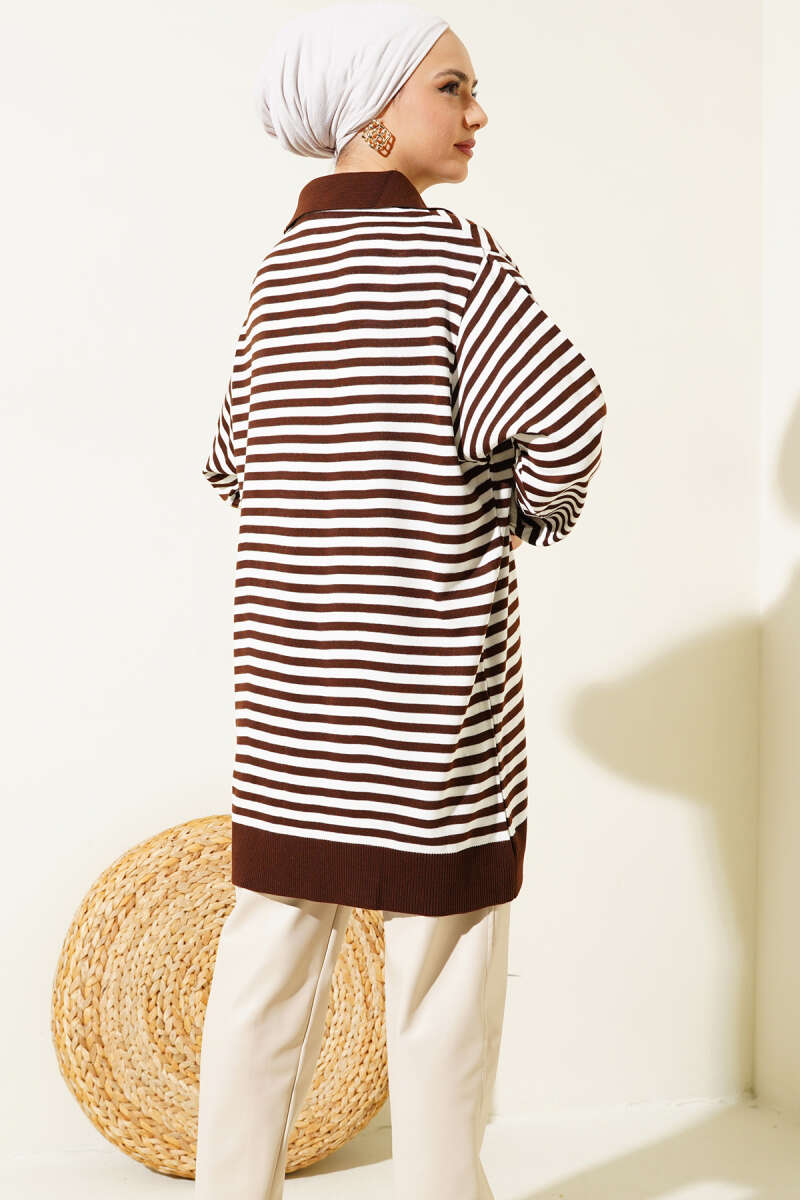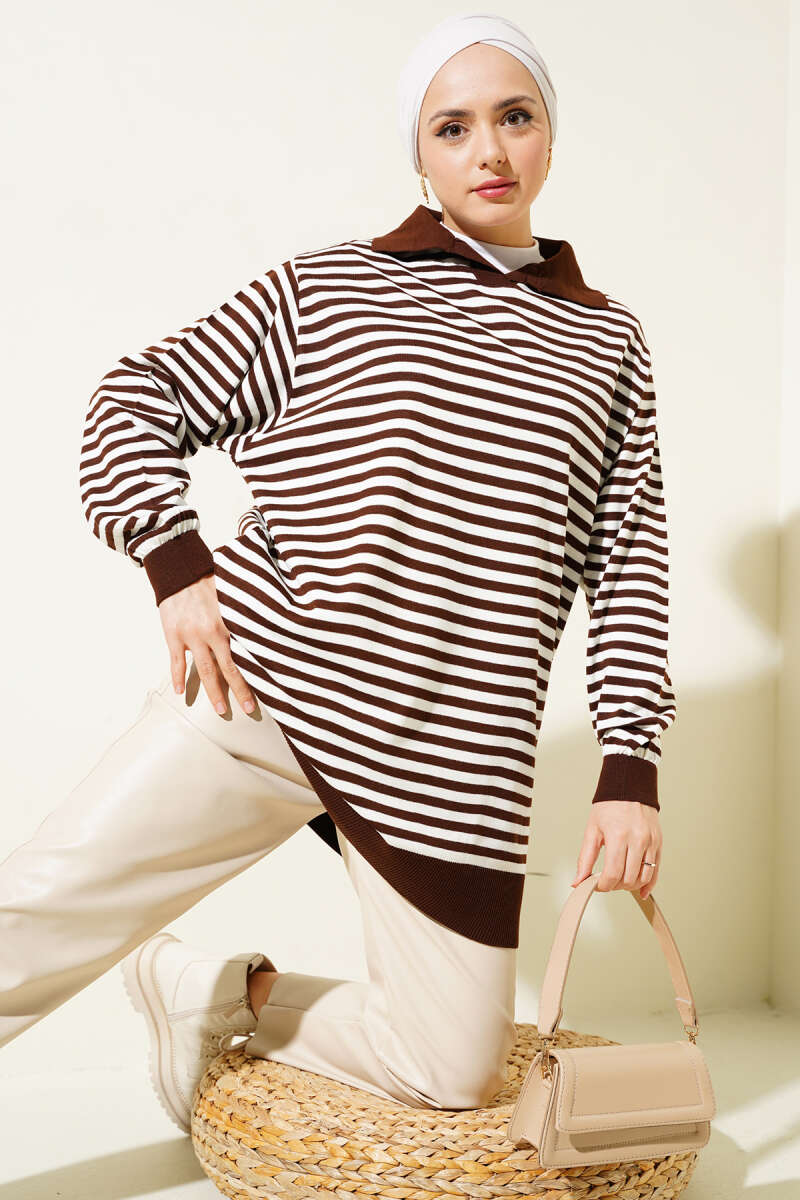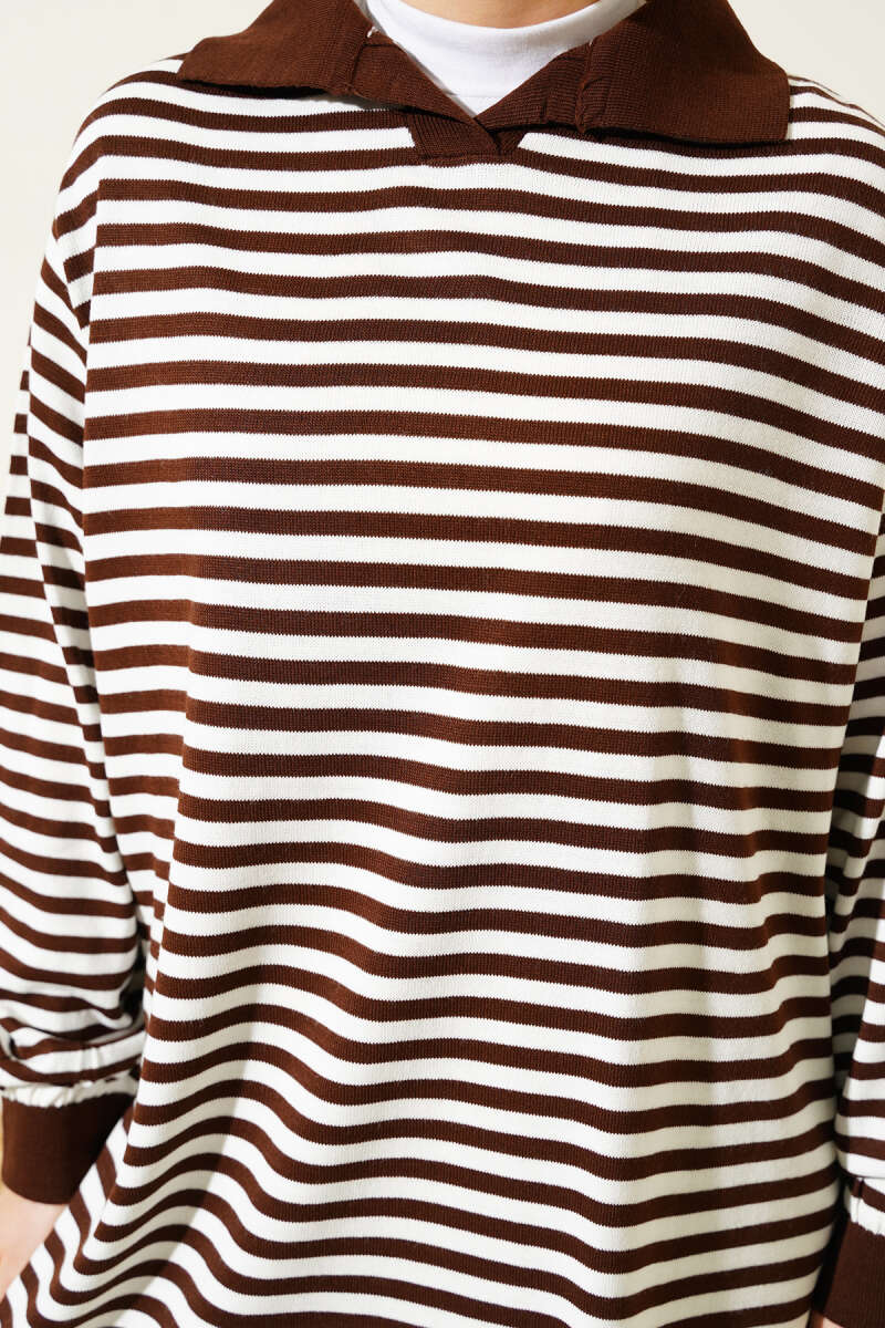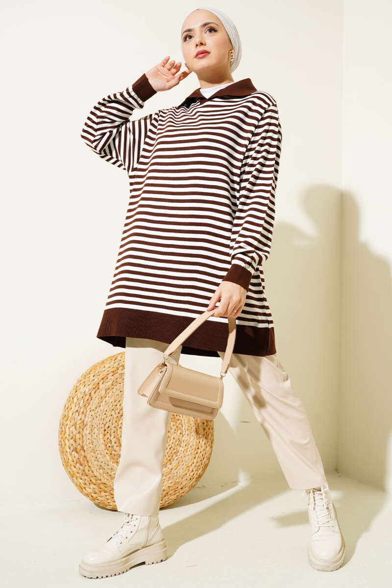 Asimetrik Kabartma Çizgili Triko Tunik Kahve