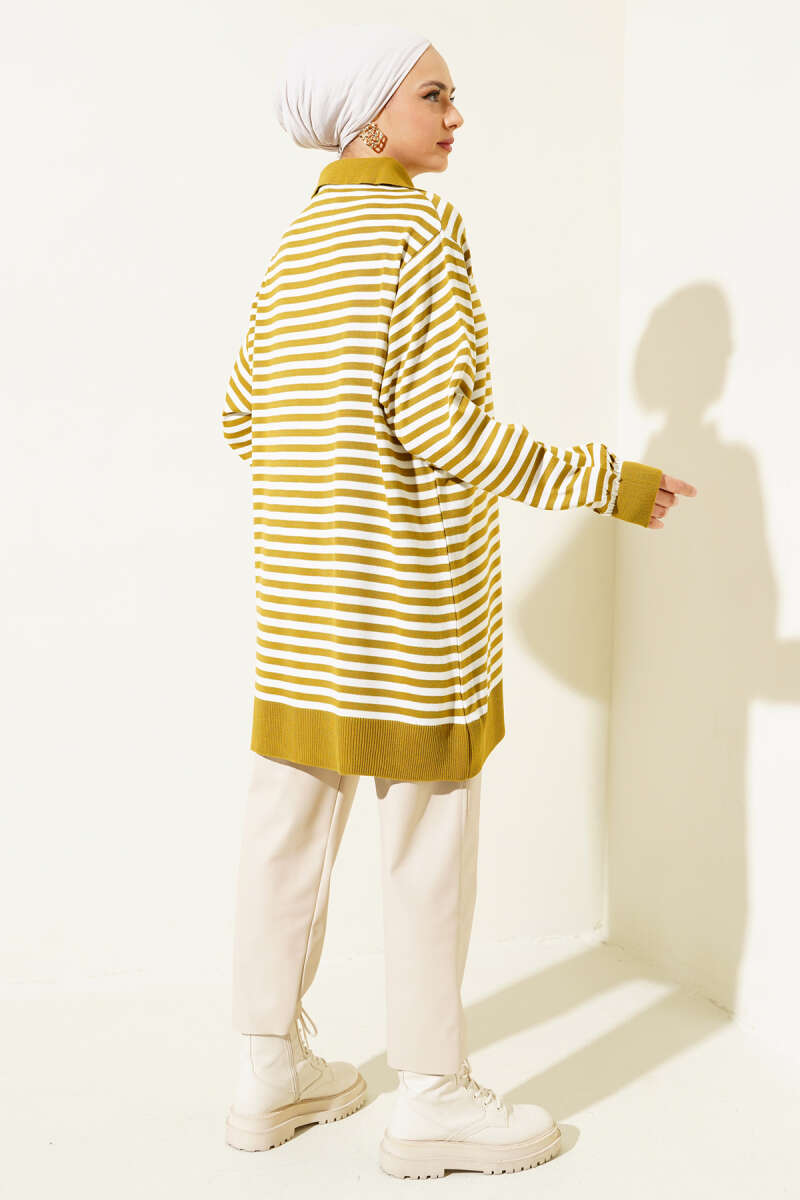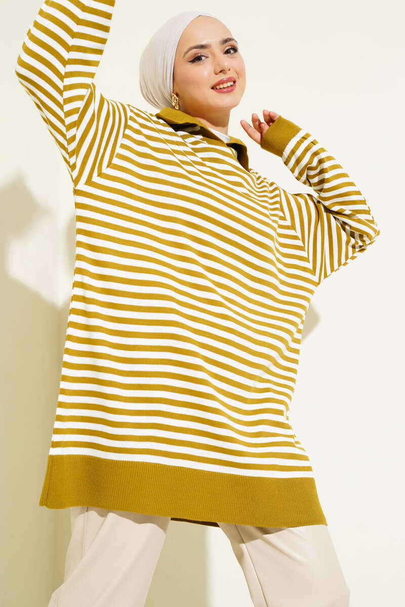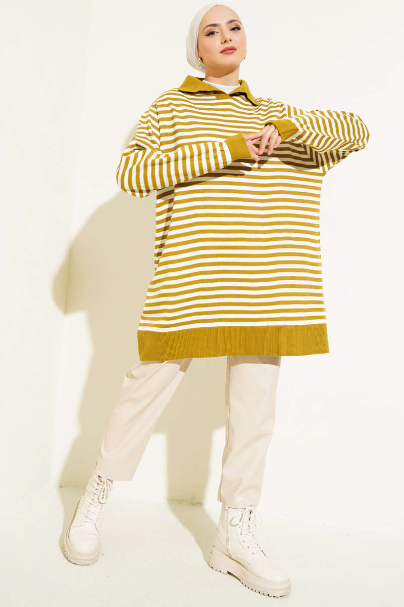Asimetrik Kabartma Çizgili Triko Tunik Sarı