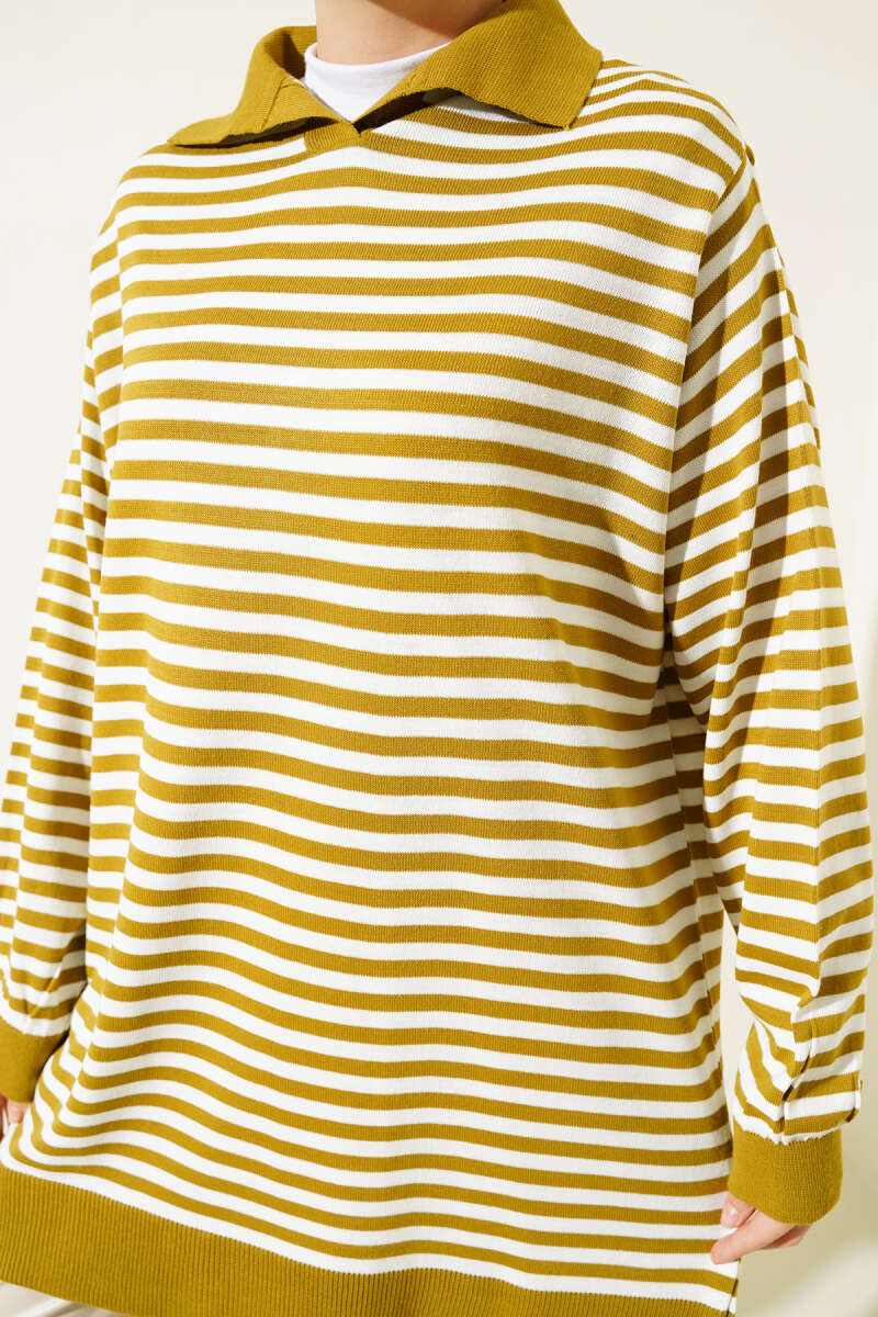 Asimetrik Kabartma Çizgili Triko Tunik Yağ Yeşili