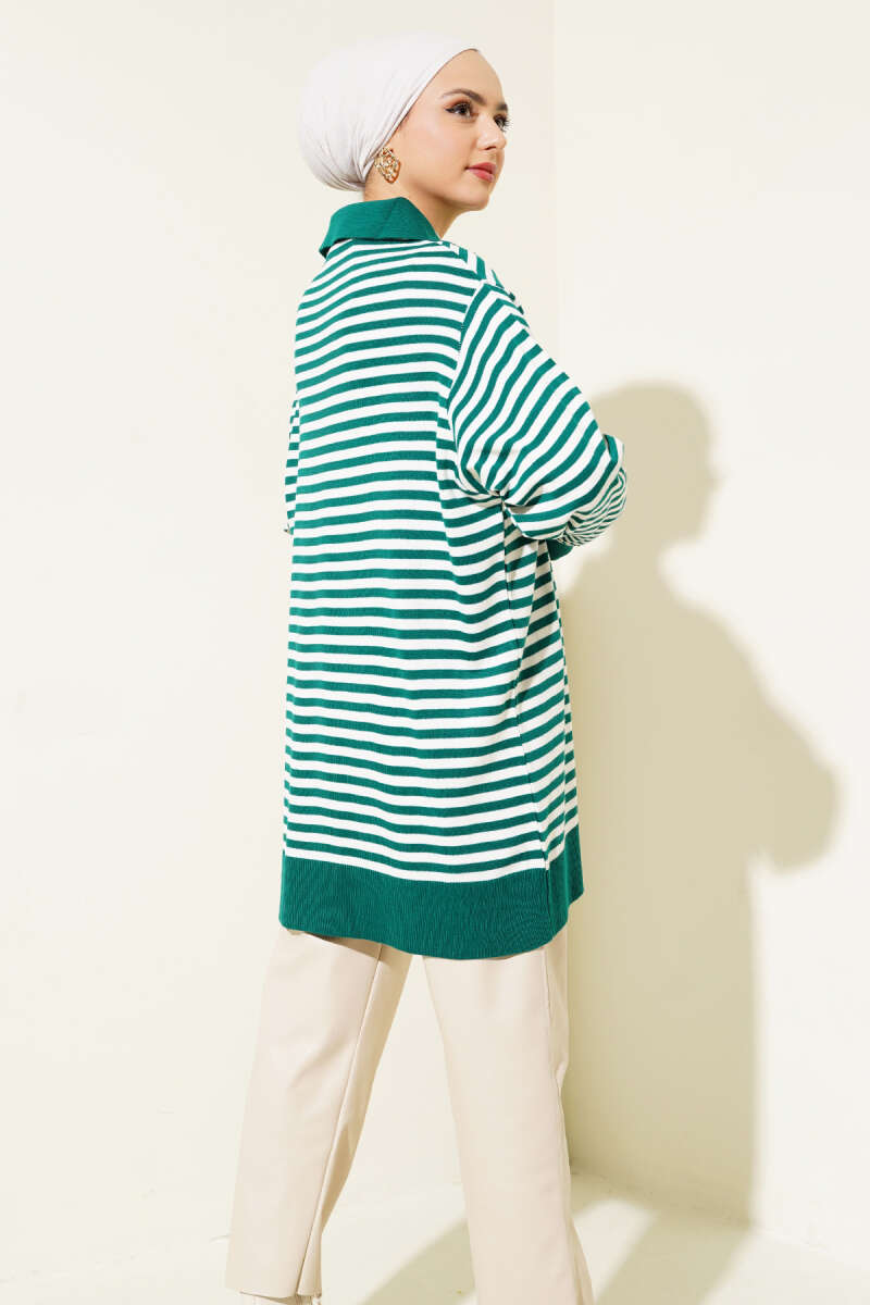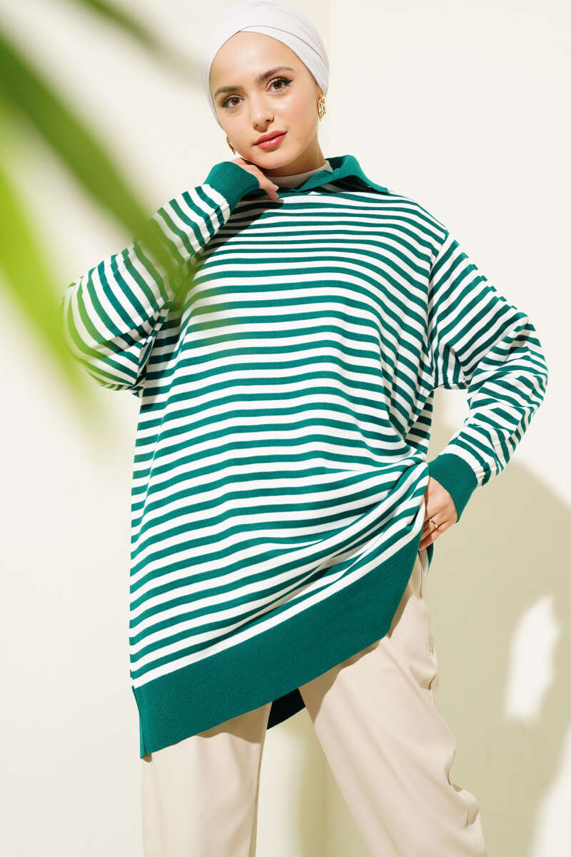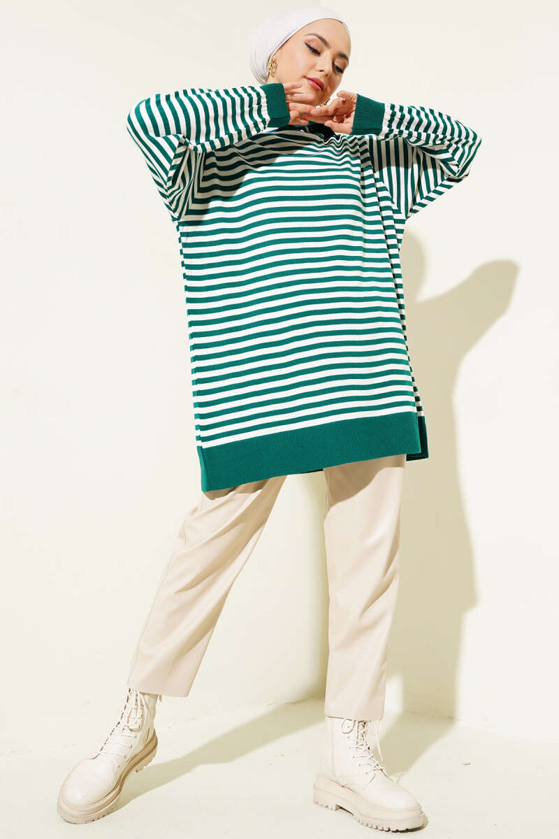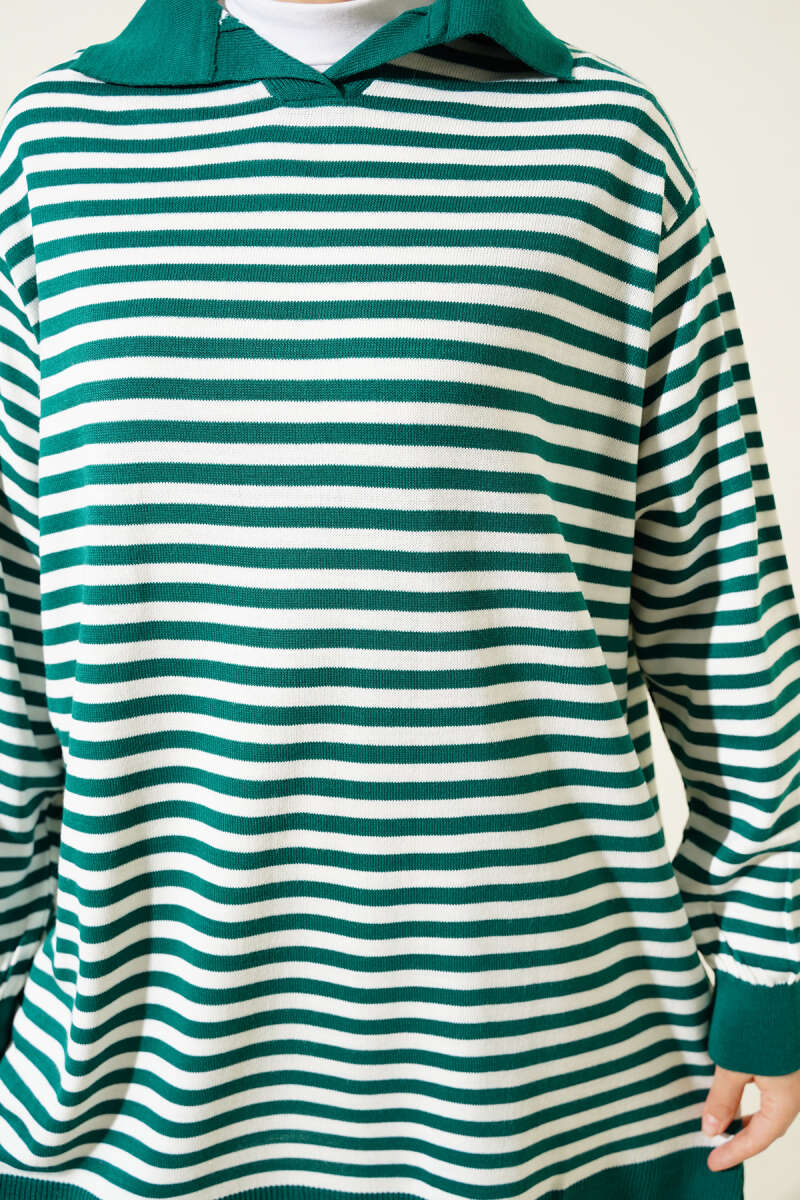 Asimetrik Kabartma Çizgili Triko Tunik Yağ Yeşili