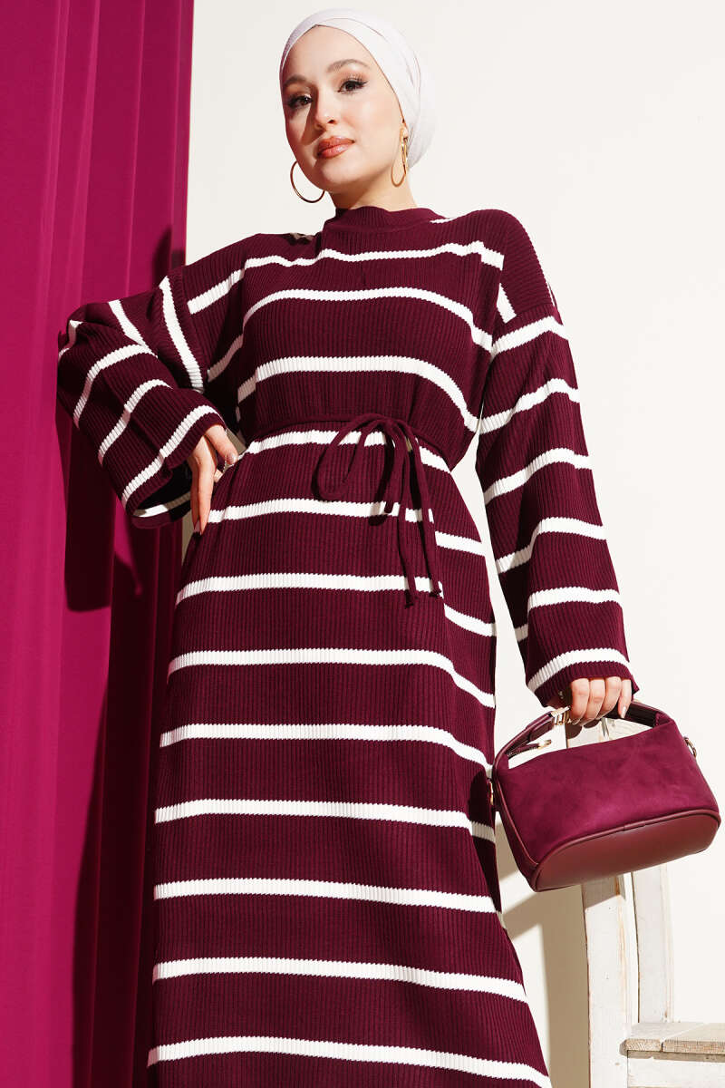Duble Kol İp Kuşaklı Loyşa Elbise Bordo