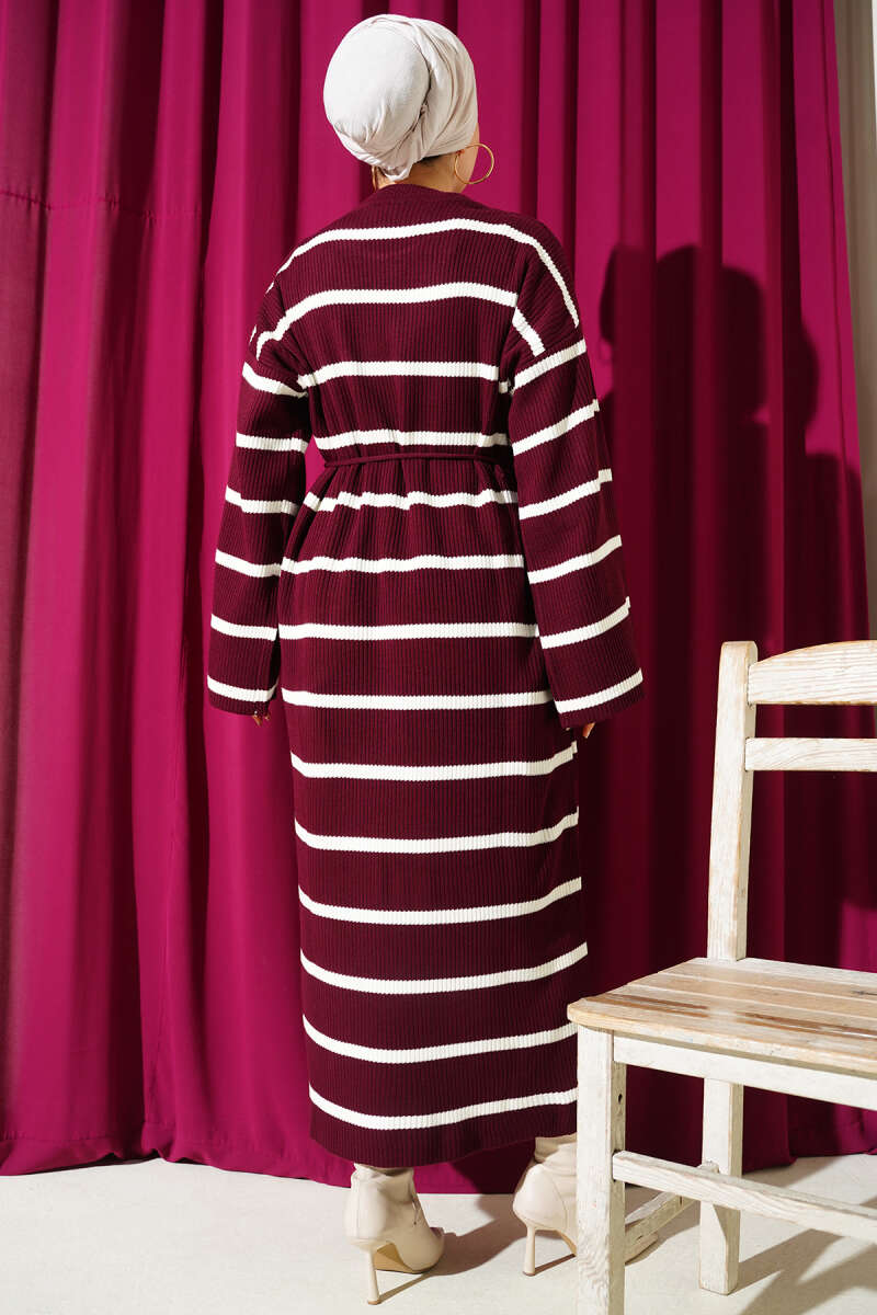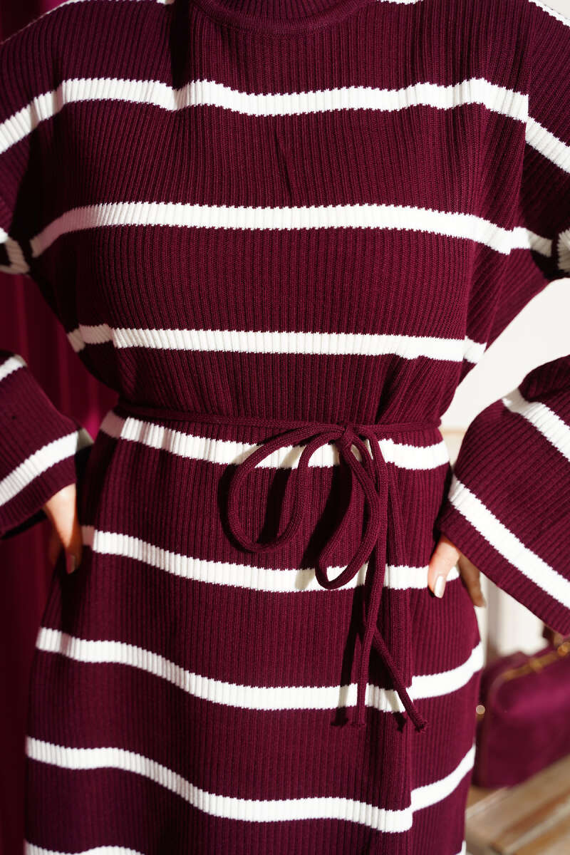 Yatay Çizgili İp Bağcıklı Triko Elbise Kahve