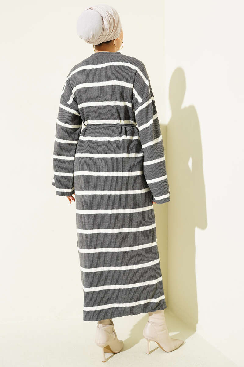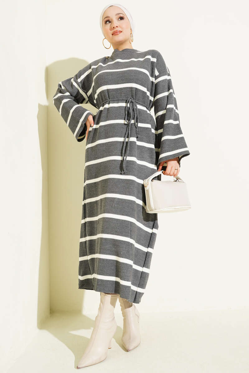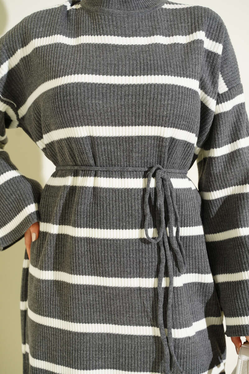 Yatay Çizgili İp Bağcıklı Triko Elbise Vizon