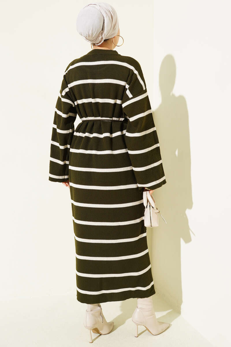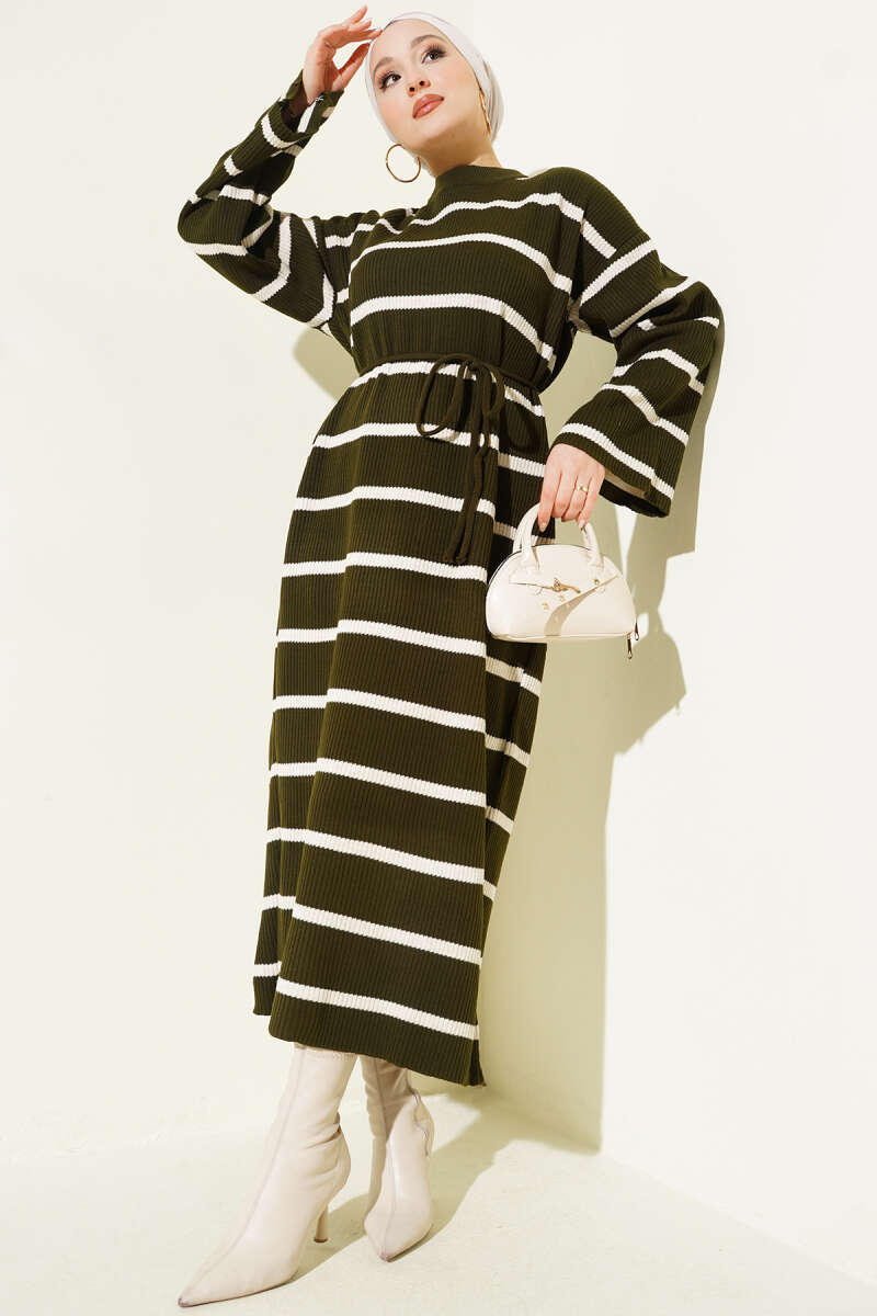 Yatay Çizgili İp Bağcıklı Triko Elbise Kahve