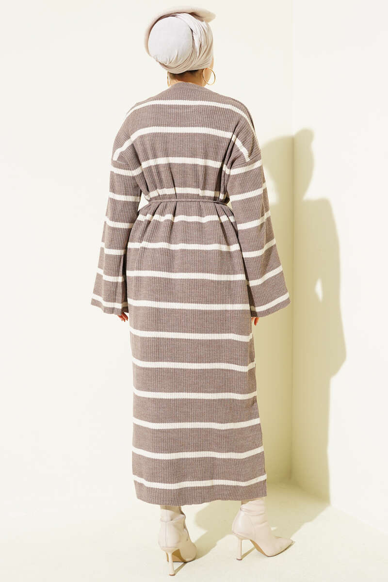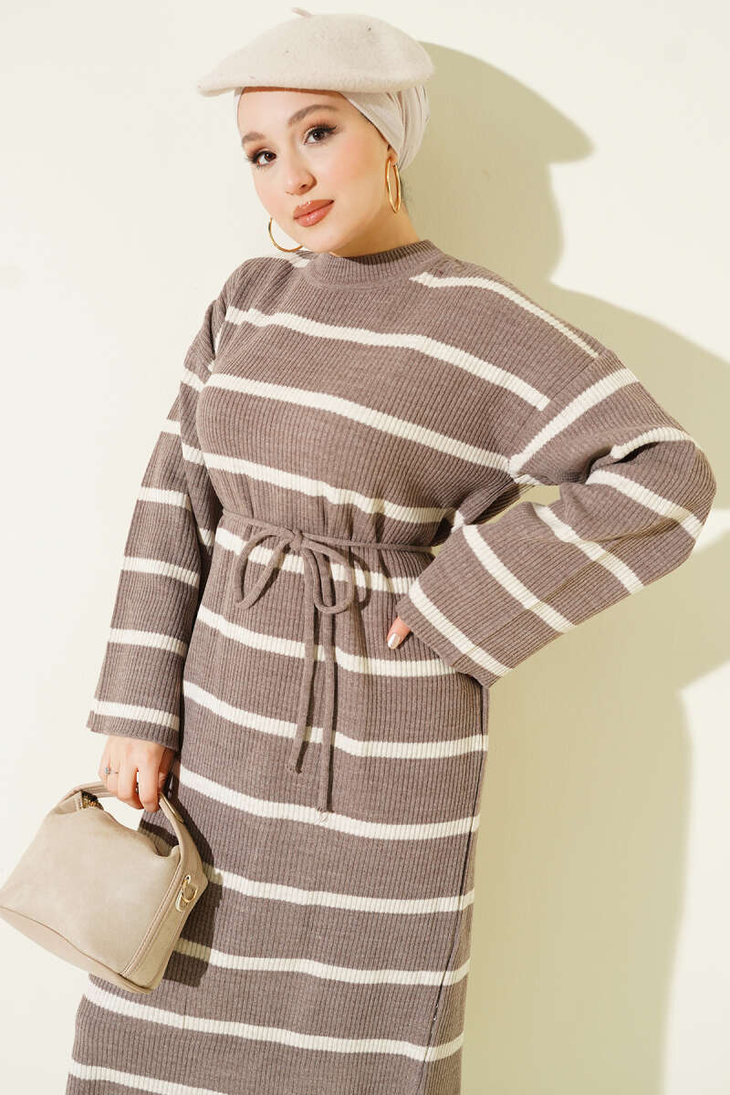 Yatay Çizgili İp Bağcıklı Triko Elbise Kahve