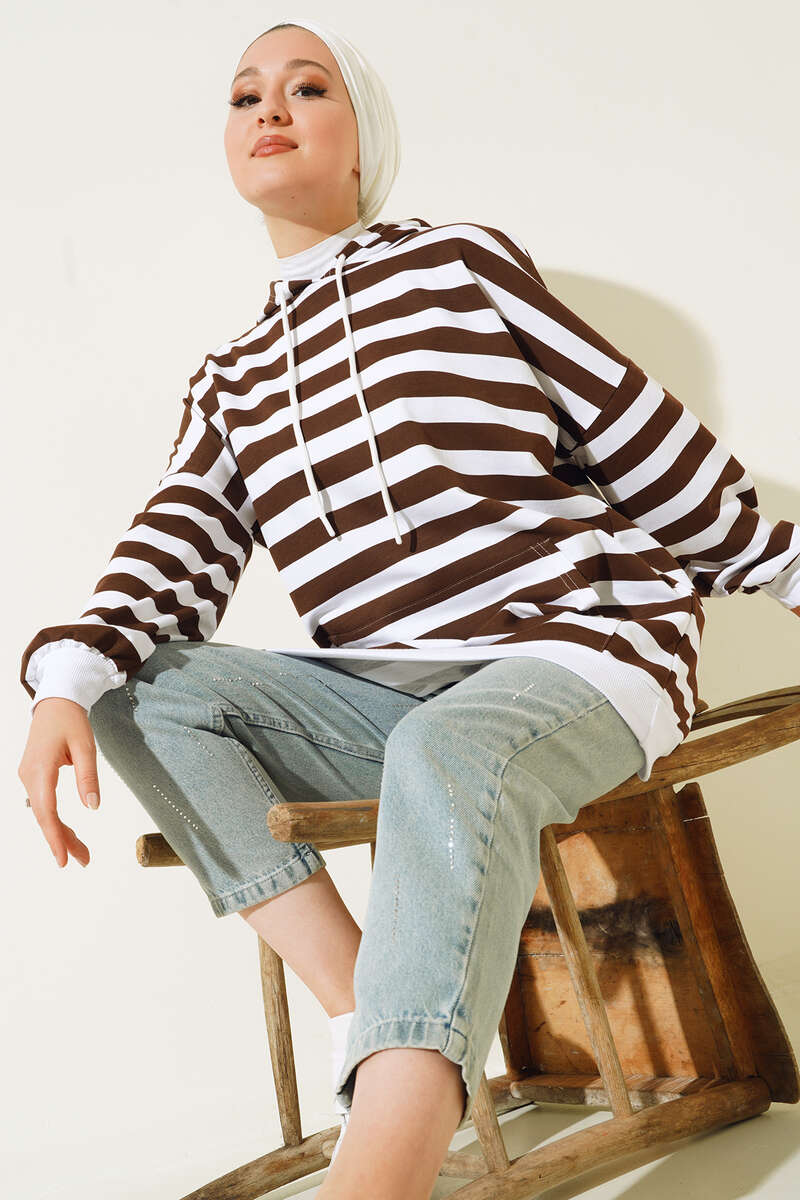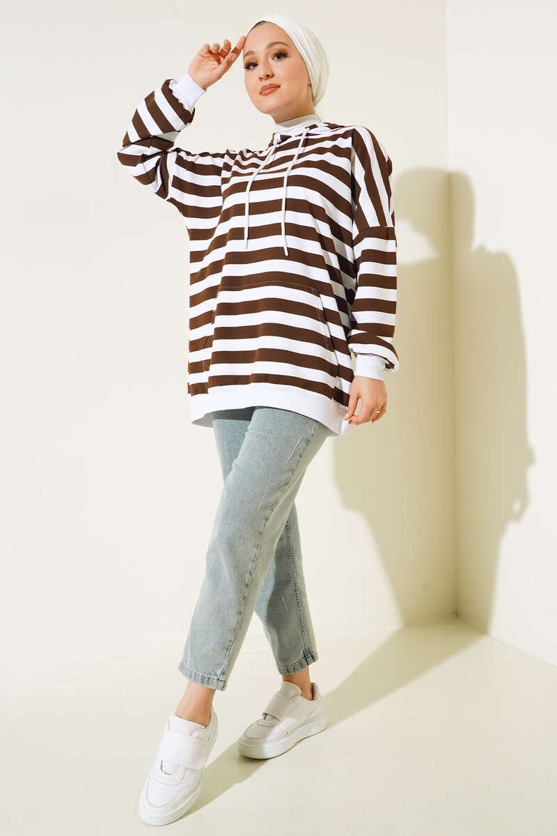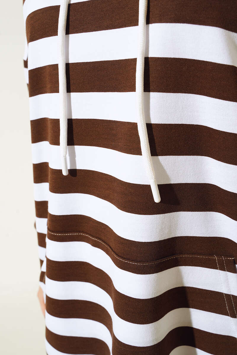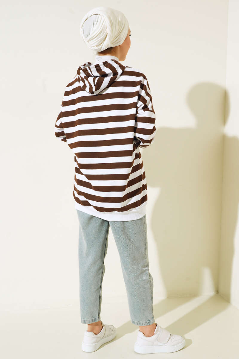 Yatay Çizgili Kapüşonlu Tunik Kahve