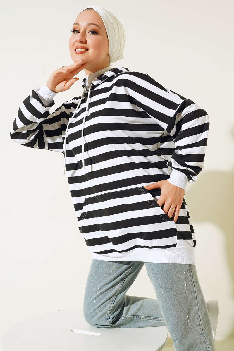Yeni sezon tuniğimiz yatay çizgileriyle sportif bir görünüm kazanmıştır. Rahatlıkla kombinleyebileceğiniz tuniğimiz kapüşonludur. Kapüşonu ip bağlamalıdır. Kanguru cebe sahip tuniğimizin manşetleri ribanalıdır.