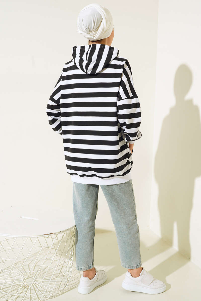 Yatay Çizgili Kapüşonlu Tunik Siyah