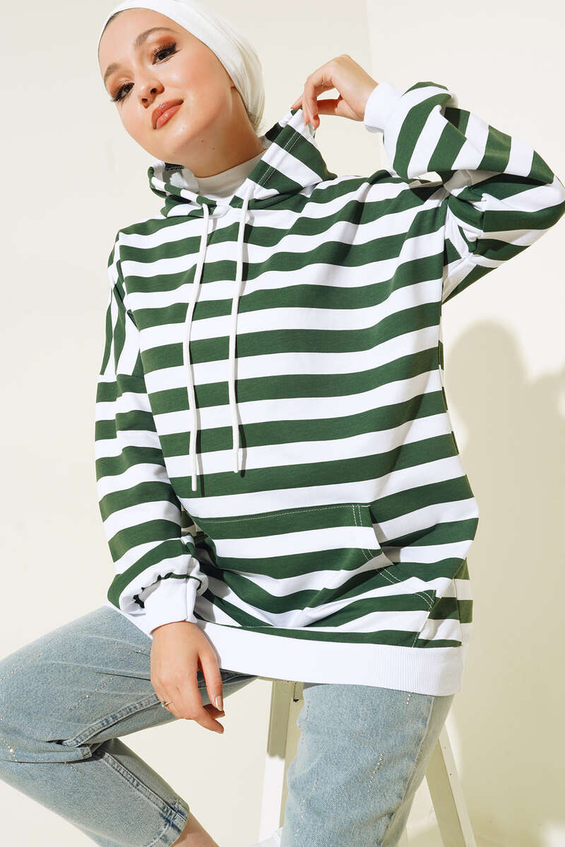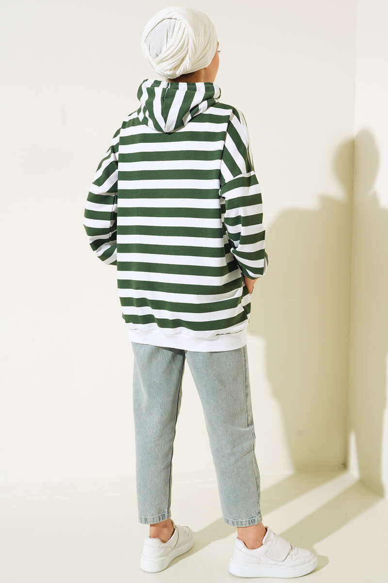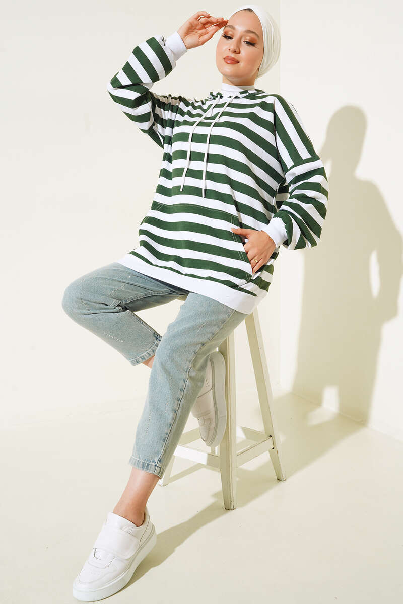 Yatay Çizgili Kapüşonlu Tunik Yeşil