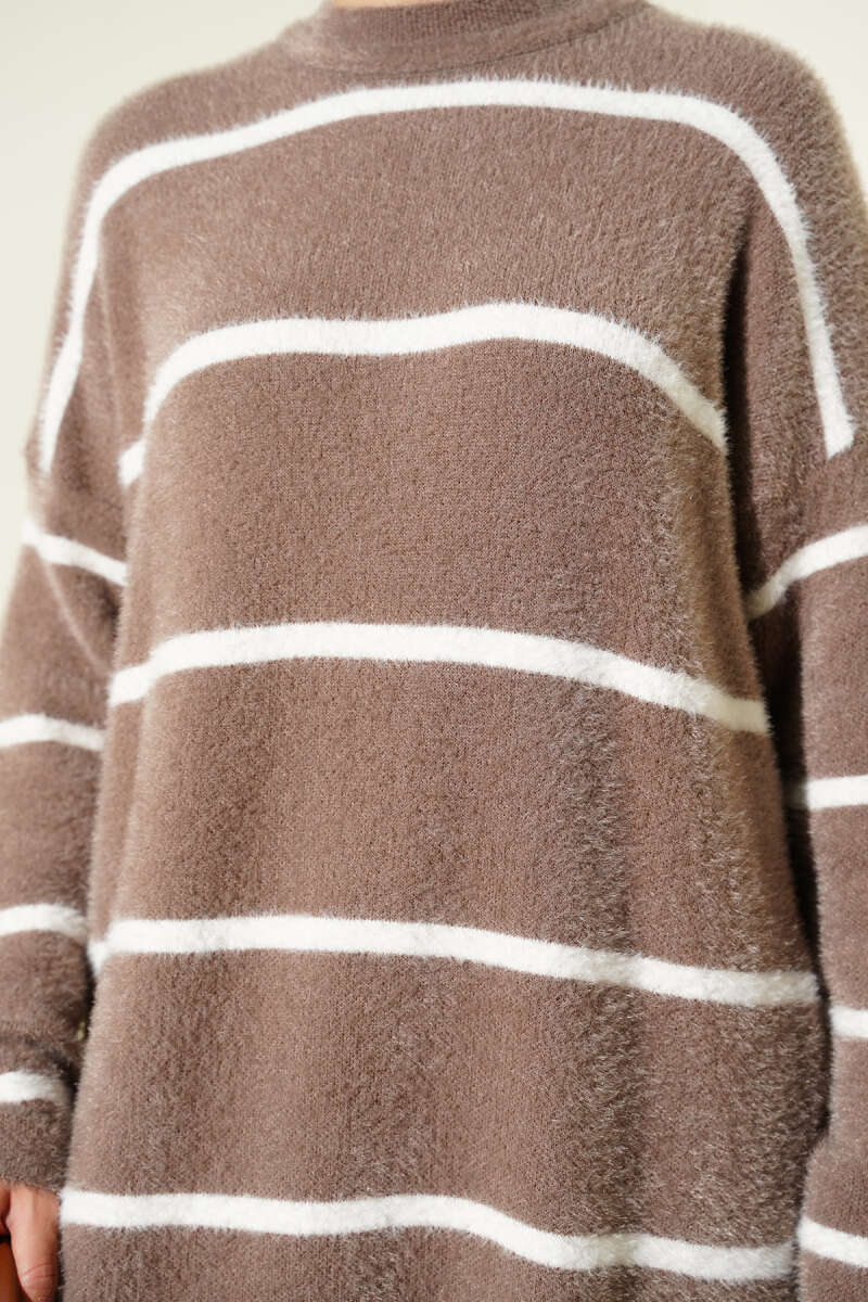 Yatay Çizgili Sakallı Triko Tunik Ekru
