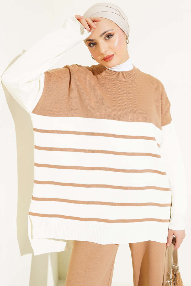 Dikiş Detaylı Basic Triko İkili Takım Bej