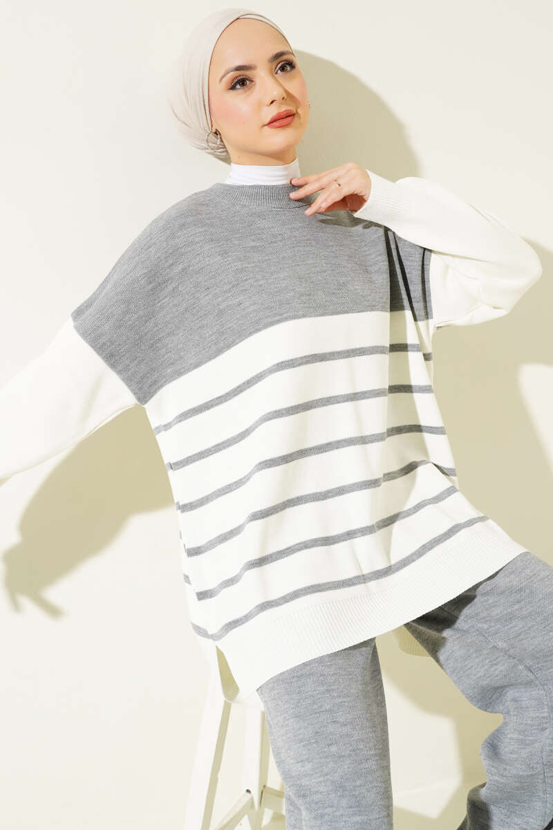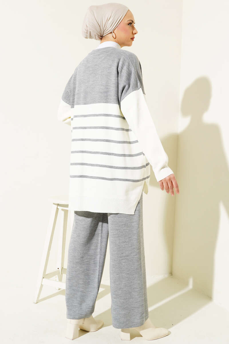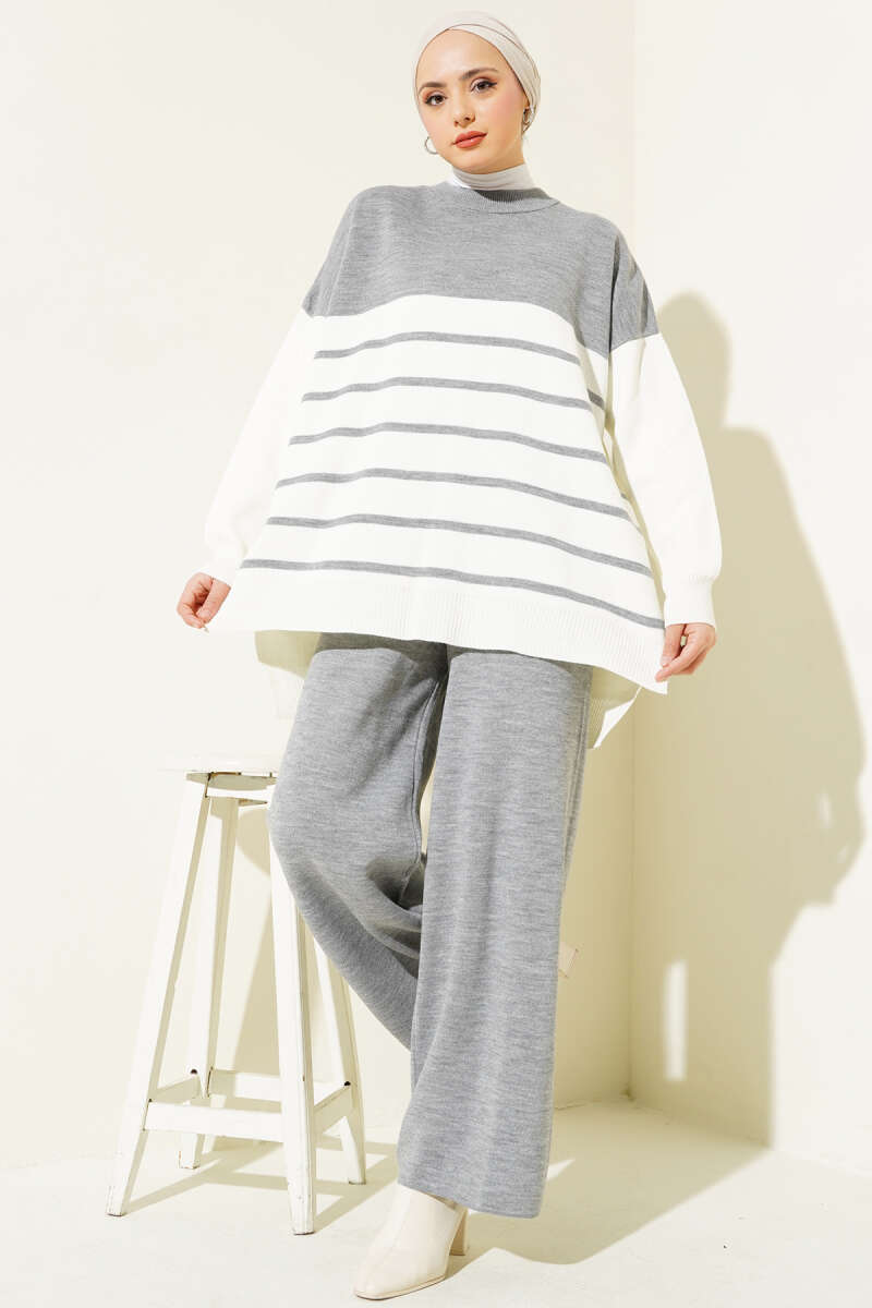 Yatay Çizgili Triko Salaş İkili Takım Gri