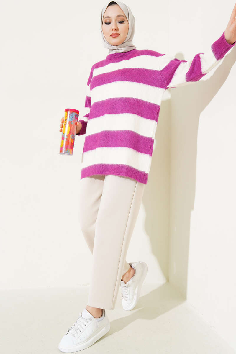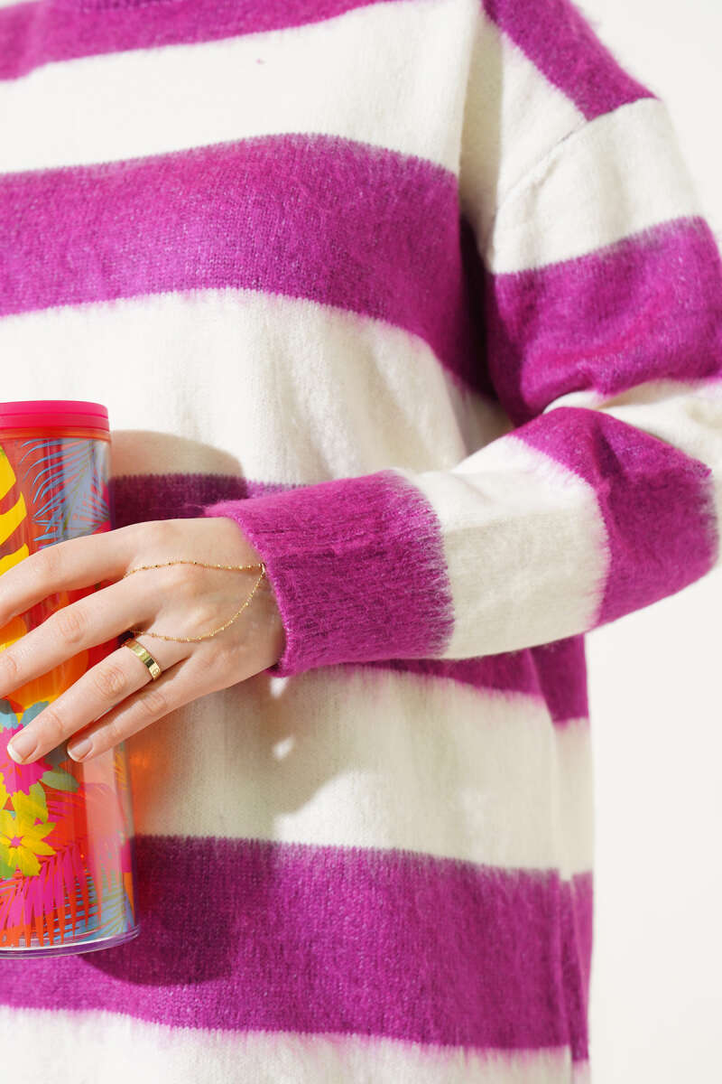 Yatay Çizgili Yumoş Triko Tunik Fuşya