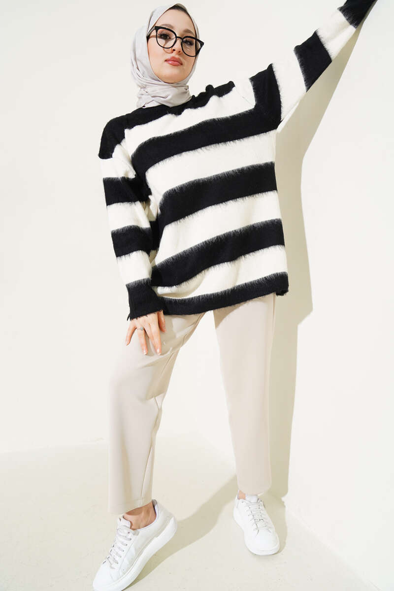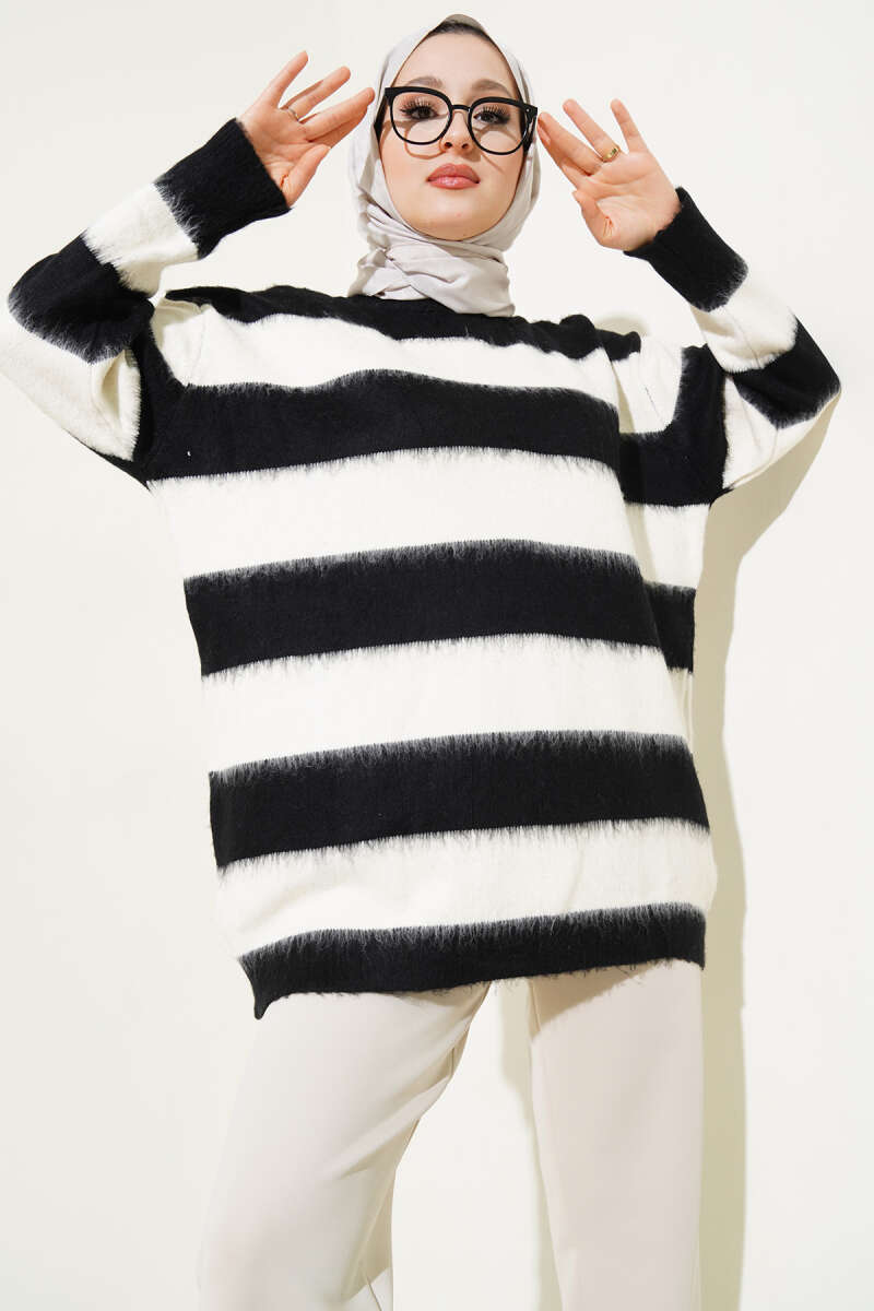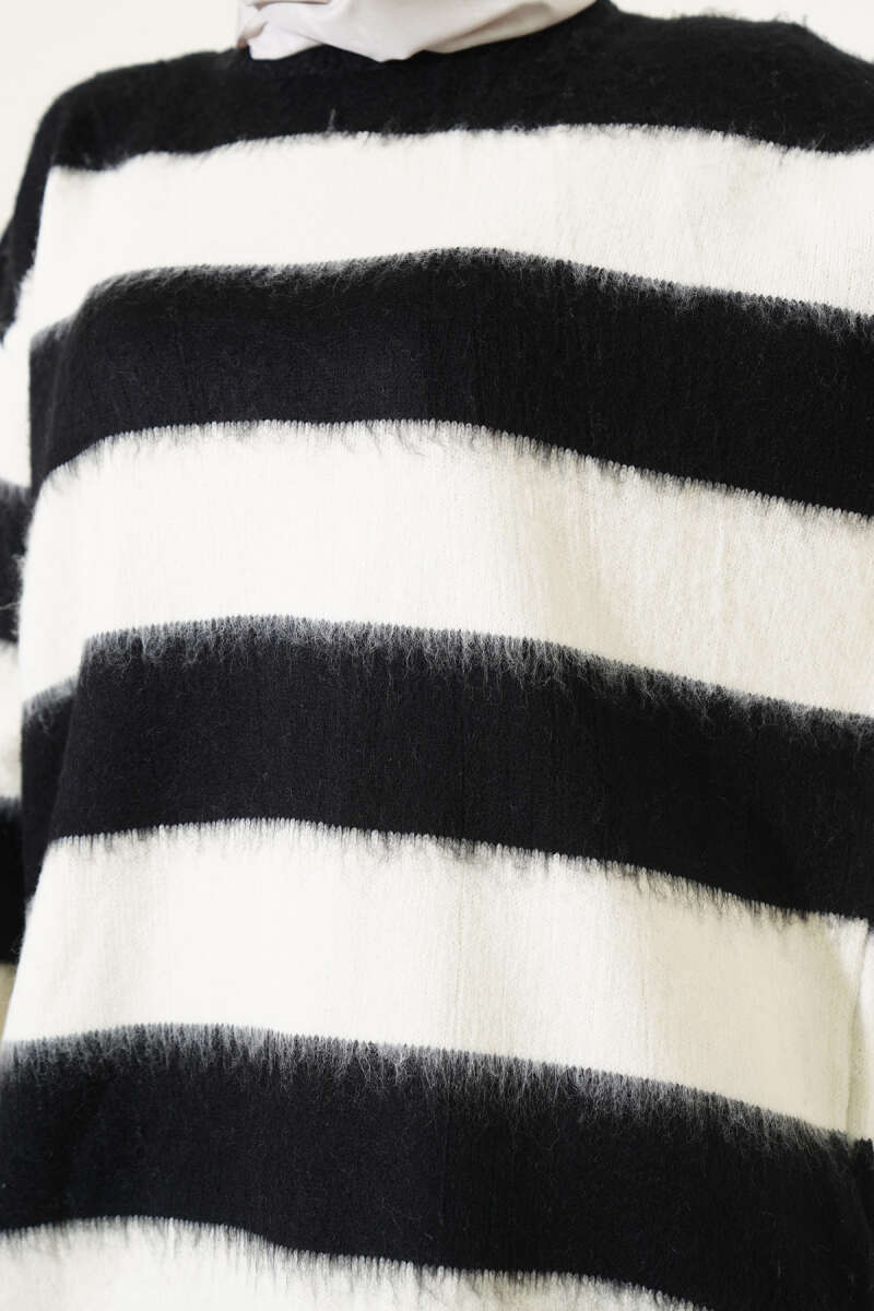 Yatay Çizgili Yumoş Triko Tunik Siyah