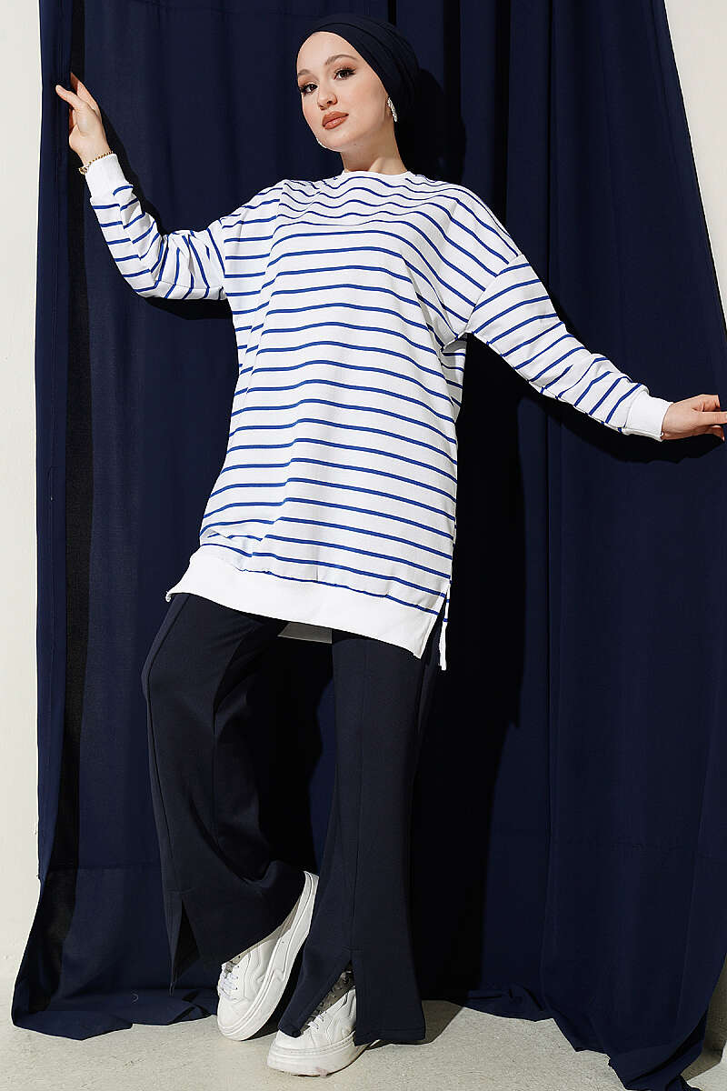 Yatay İnce Çizgili Ribanalı Tunik Saks