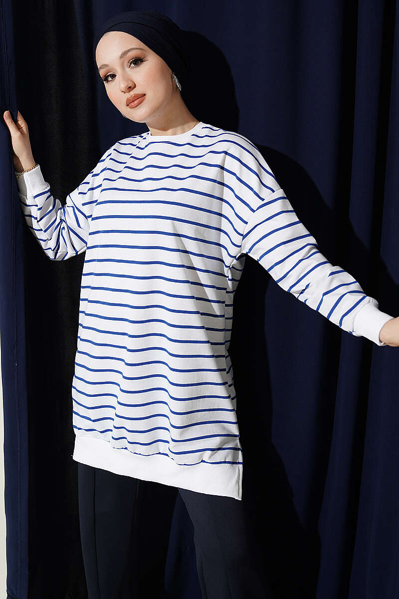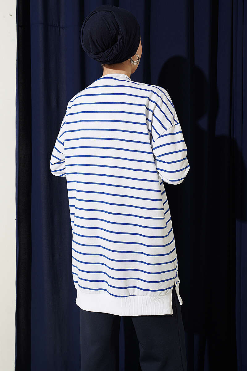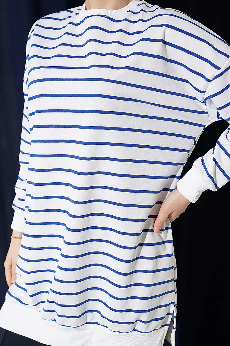 Yatay İnce Çizgili Ribanalı Tunik Beyaz