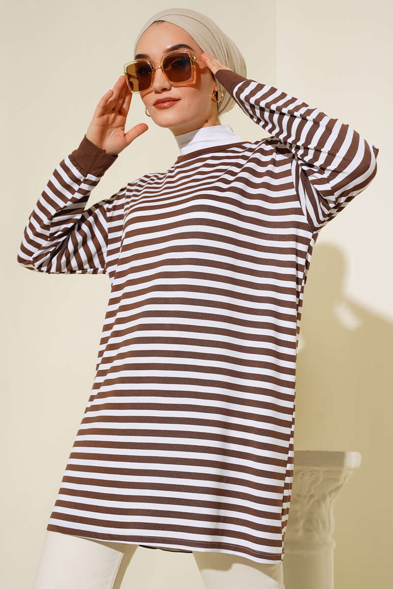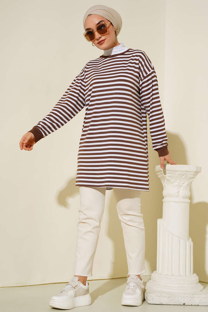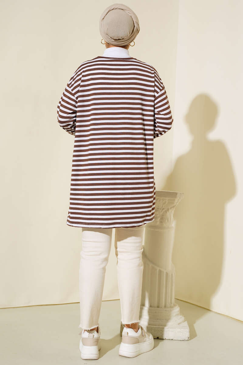 Yatay Çizgi Detaylı Triko Tunik Kahve