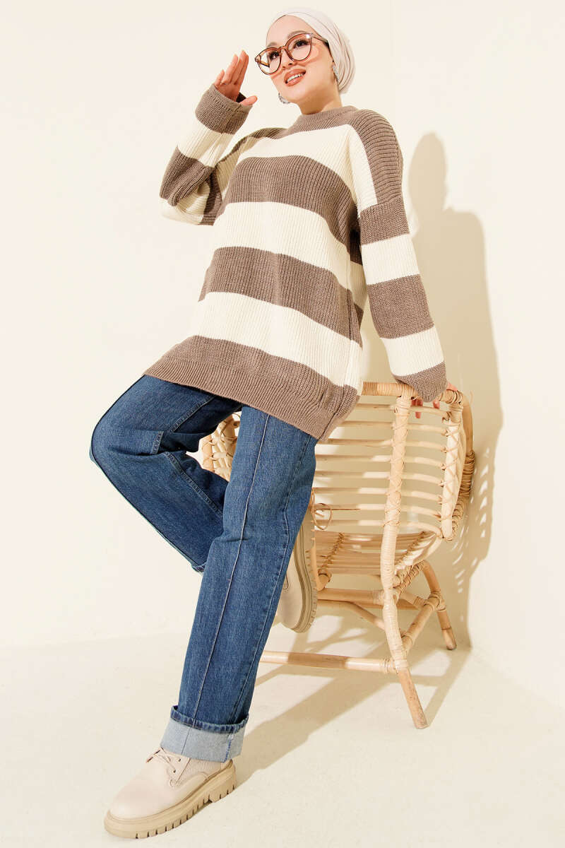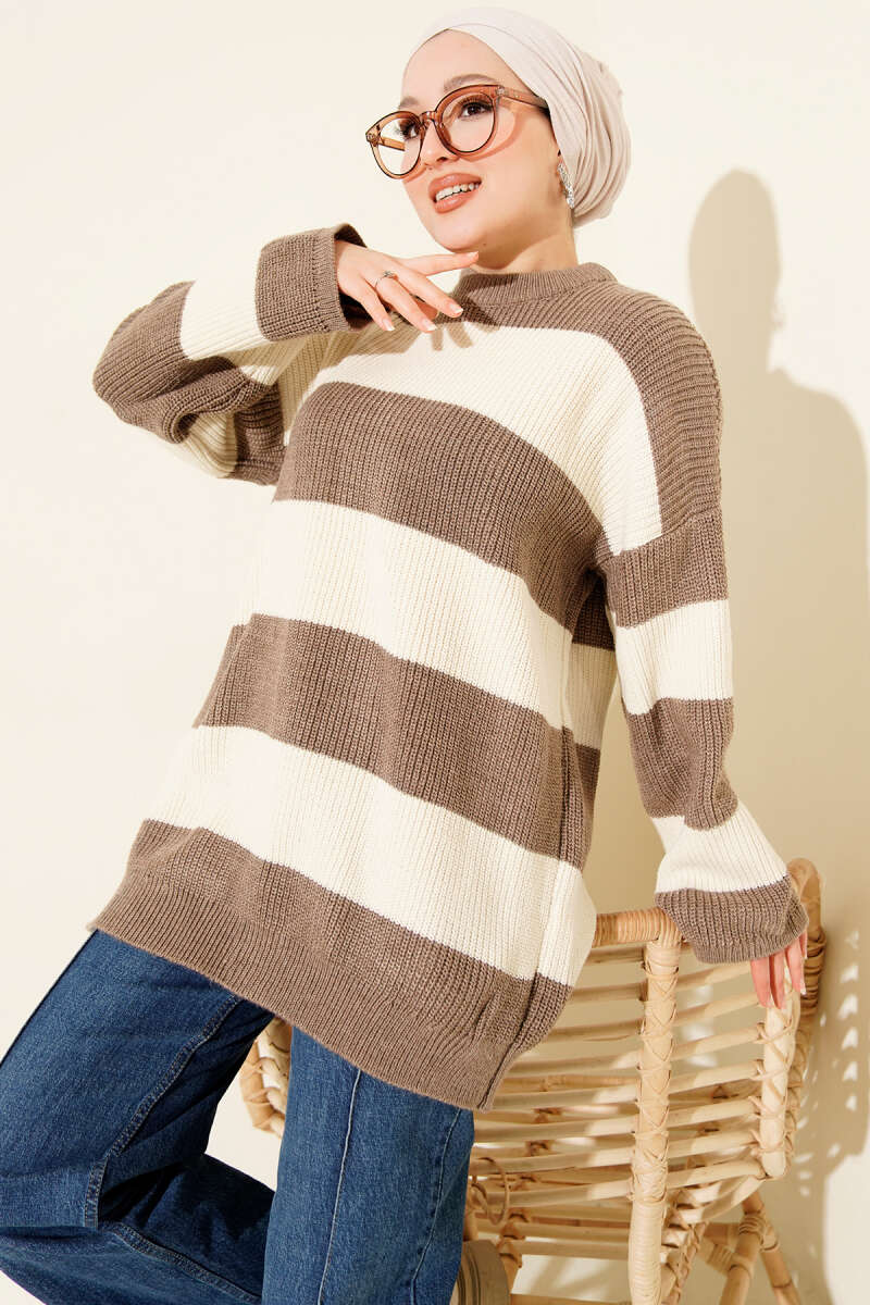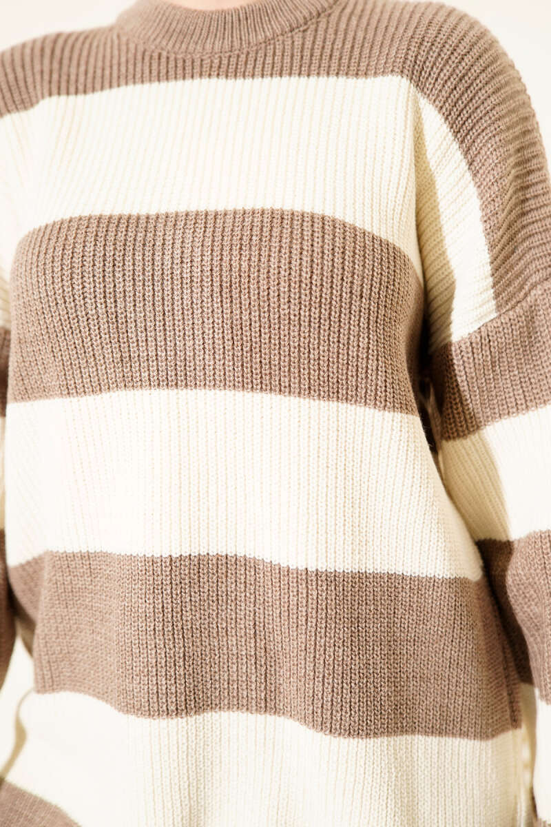 Yatay Kalın Çizgili Triko Tunik Kahve