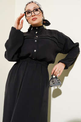 Yatay Pile Detaylı Etekli İkili Takım Siyah