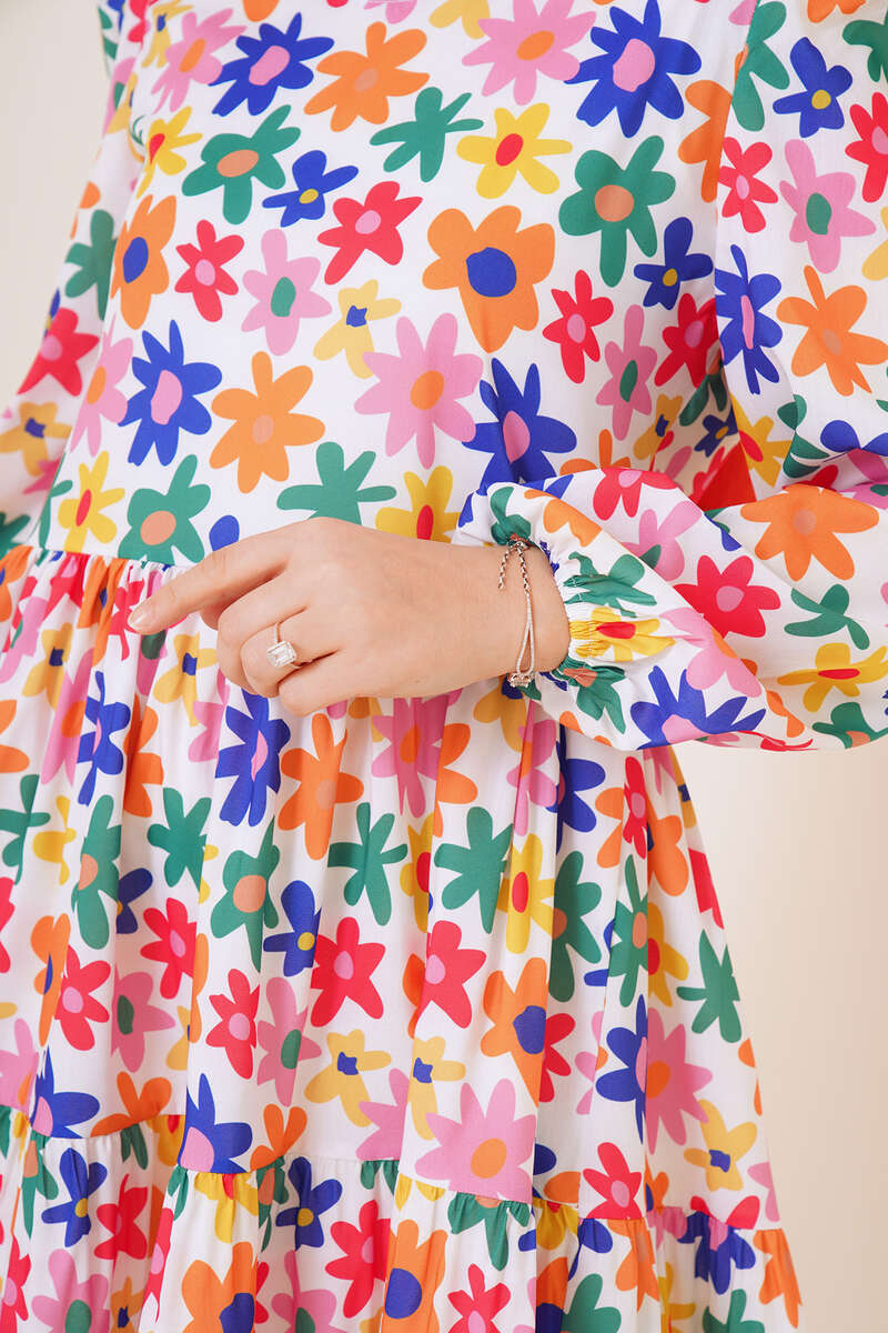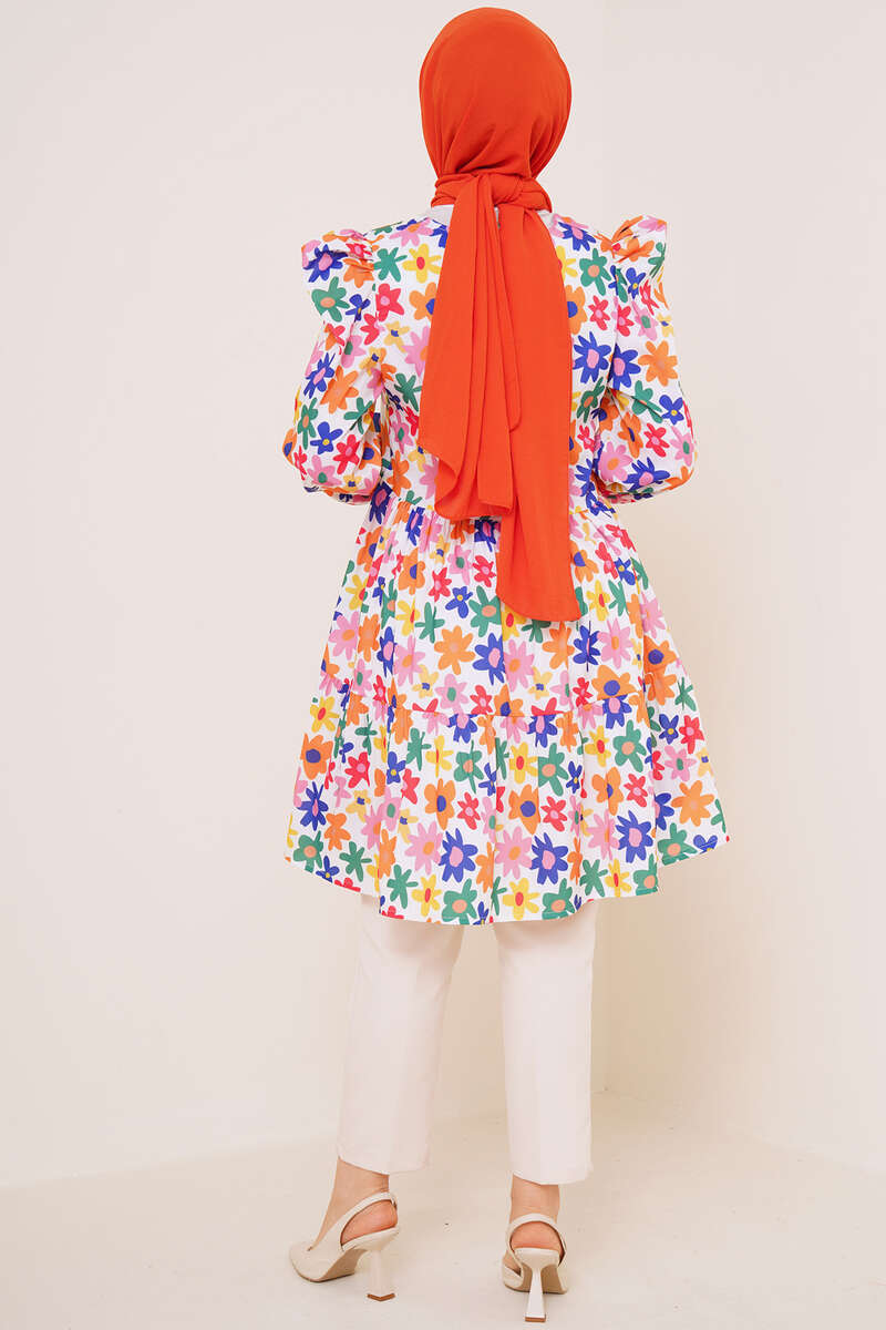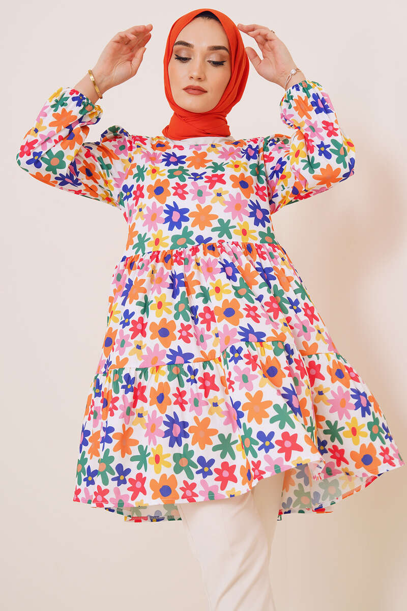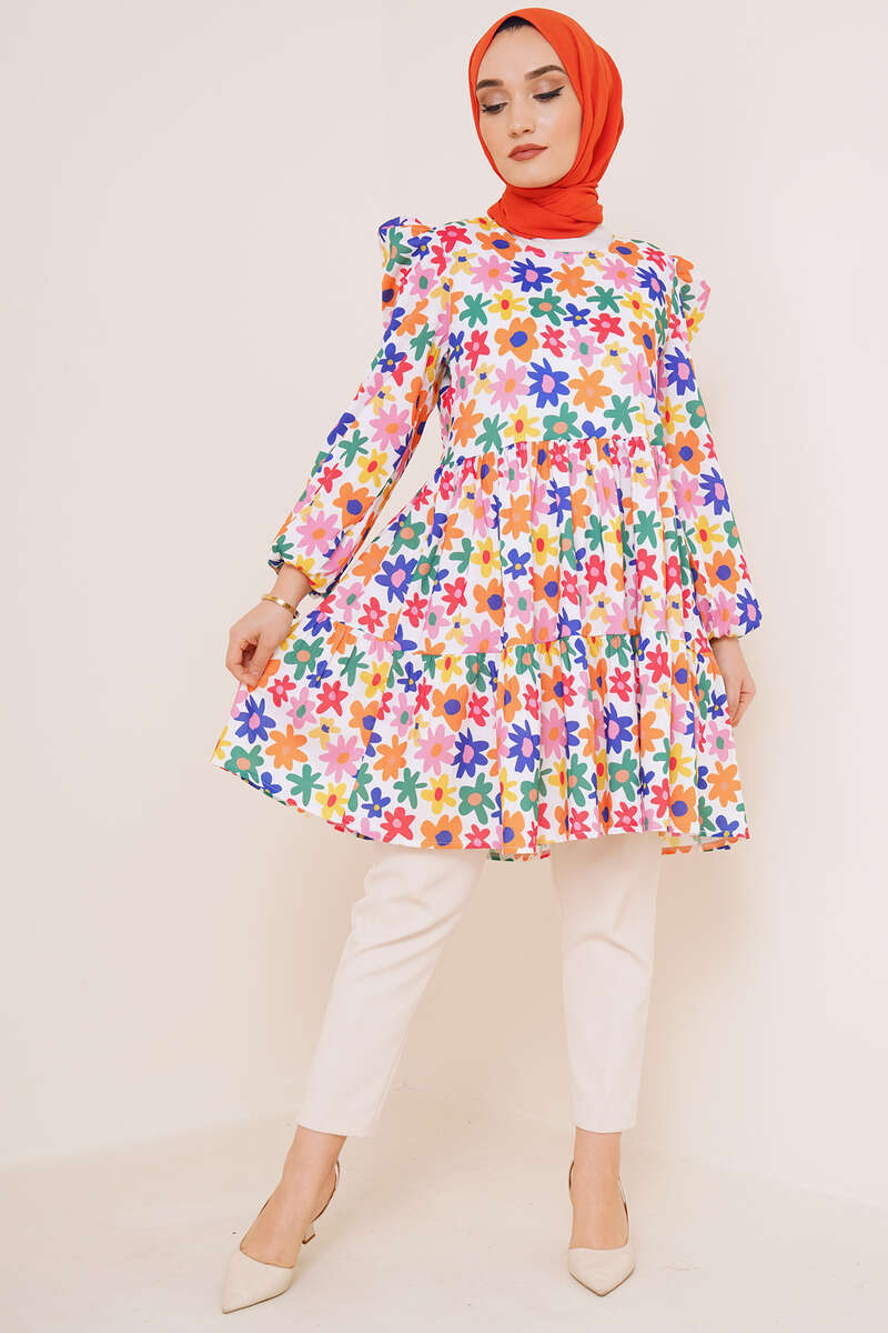 Yeni sezon tuniğimiz yaz desenleri serisine aittir. Serimiz adını birbirinden renkli ve çiçekli desenlerinden almaktadır. Kat kat model olan tuniğimizin bilekleri lastiklidir. Omuzları büzgü detaylı olan tuniğimiz oval yakadır.