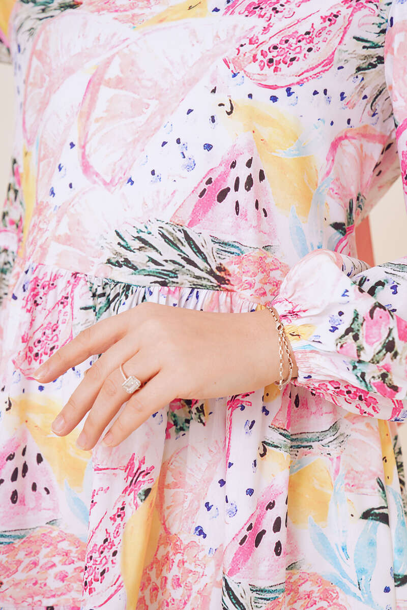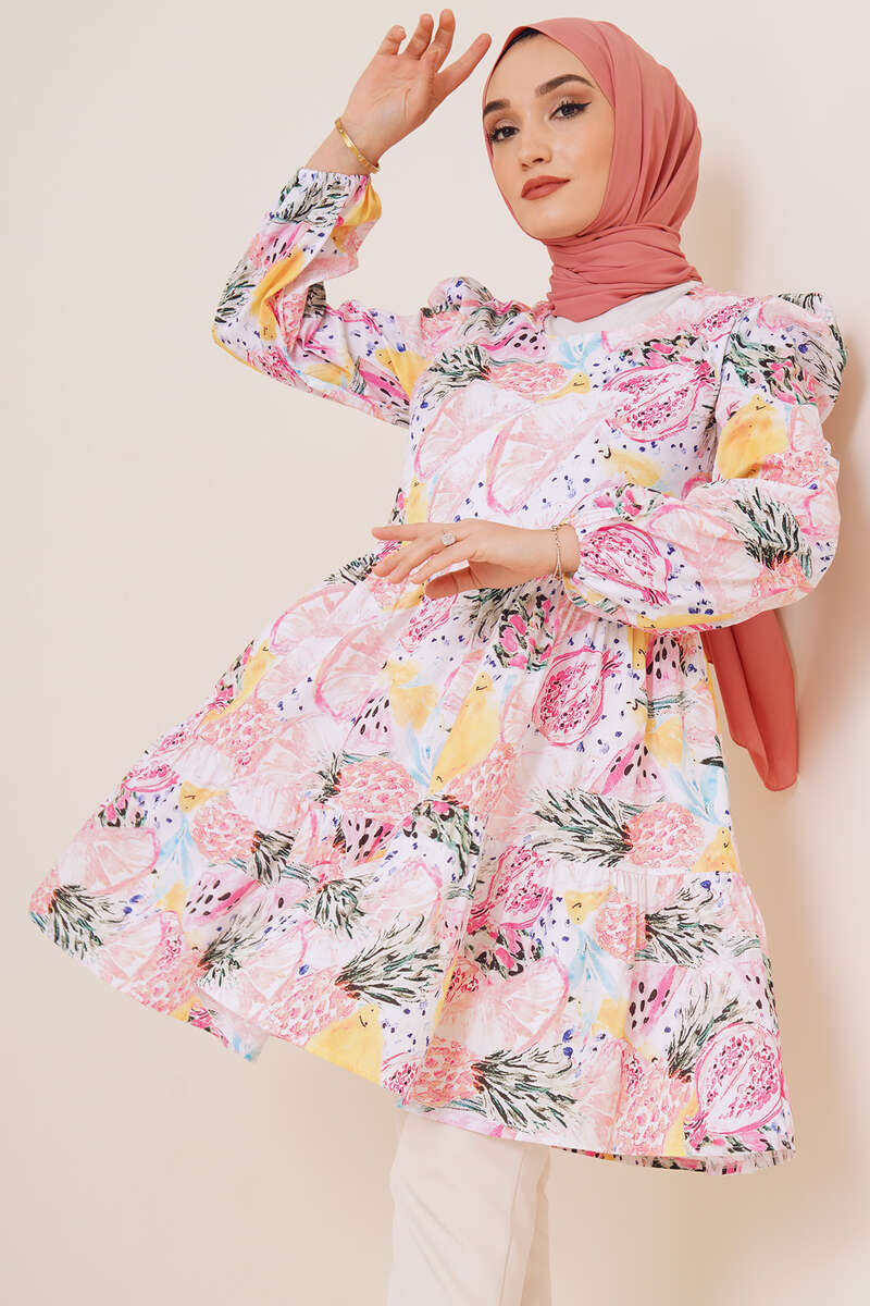 Yeni sezon tuniğimiz yaz desenleri serisine aittir. Serimiz adını birbirinden renkli ve çiçekli desenlerinden almaktadır. Kat kat model olan tuniğimizin bilekleri lastiklidir. Omuzları büzgü detaylı olan tuniğimiz oval yakadır.