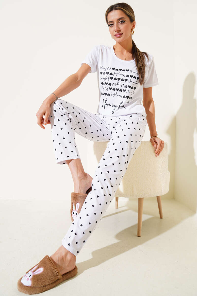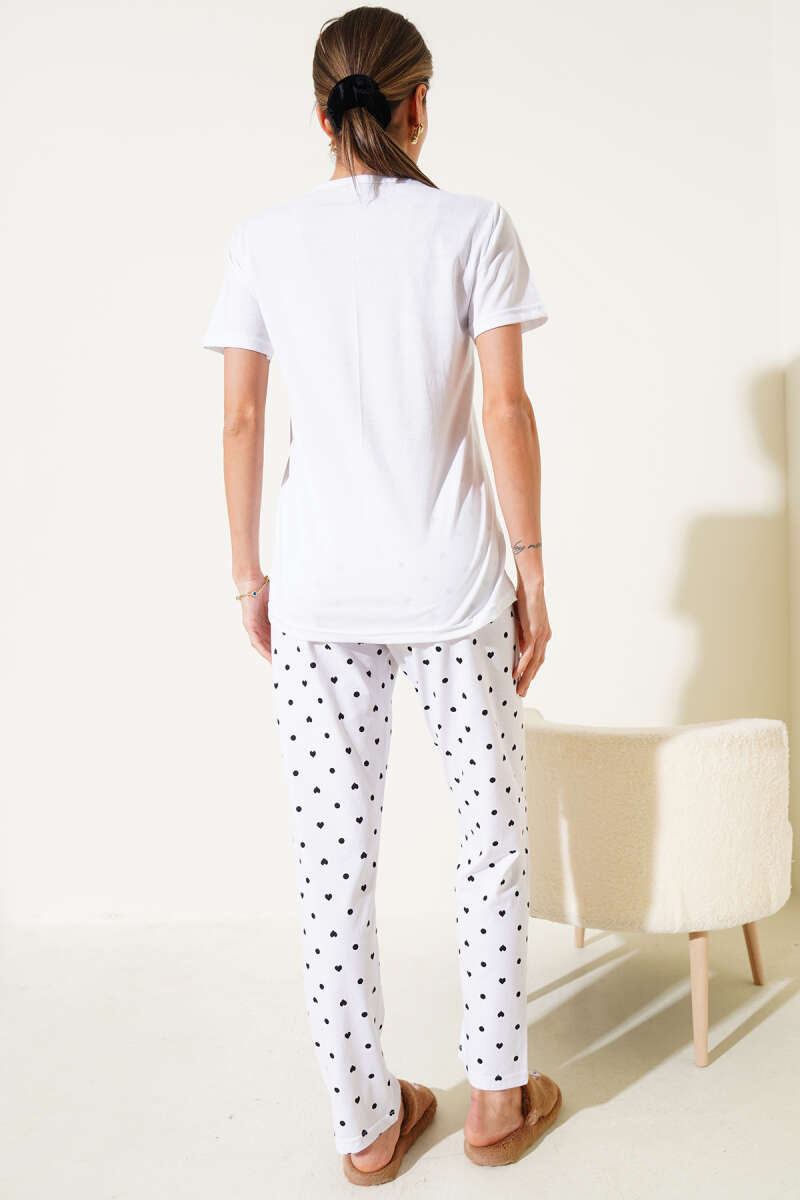 Yazılı Kalp Süslemeli Kısa Kol Pijama Takımı Beyaz