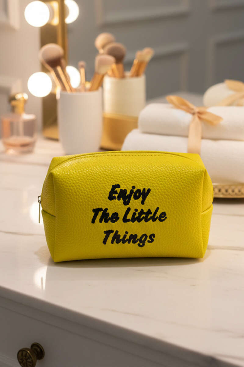 Şık ve kullanışlı tasarımıyla günlük kullanım için ideal olan yazılı makyaj çantası, kozmetik ürünlerinizi düzenli bir şekilde taşımanıza yardımcı olur. Fermuarlı yapısı sayesinde eşyalarınızı güvenle muhafaza eder.