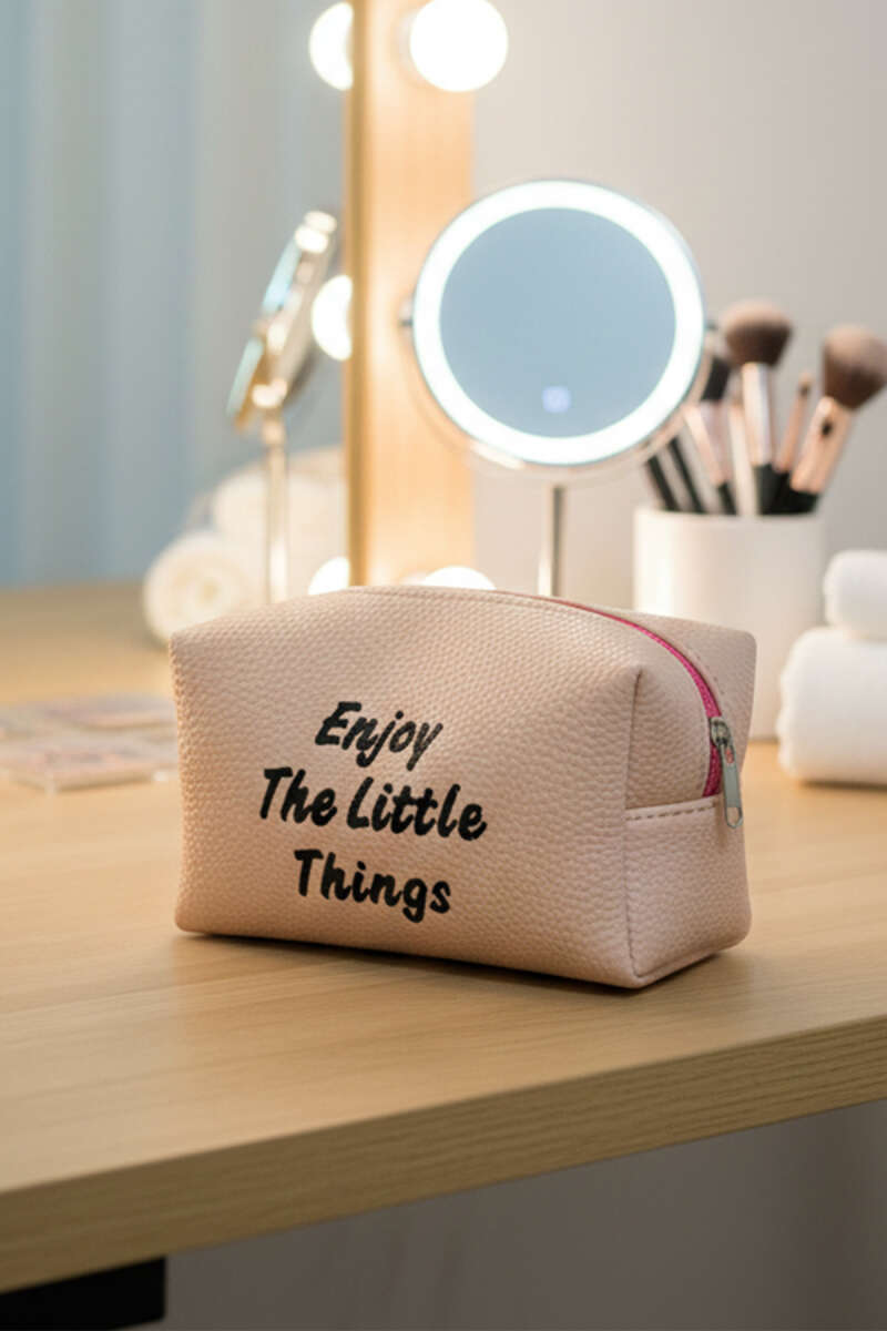Şık ve kullanışlı tasarımıyla günlük kullanım için ideal olan yazılı makyaj çantası, kozmetik ürünlerinizi düzenli bir şekilde taşımanıza yardımcı olur. Fermuarlı yapısı sayesinde eşyalarınızı güvenle muhafaza eder.