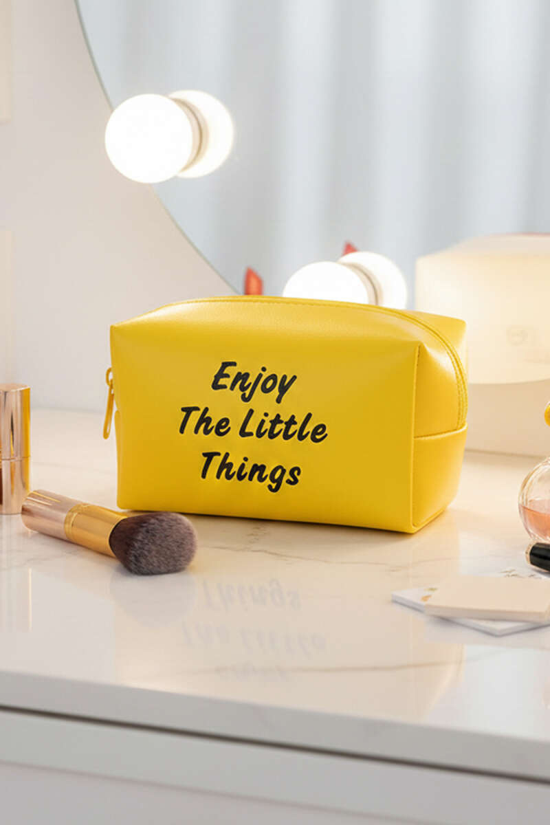 Şık ve kullanışlı tasarımıyla günlük kullanım için ideal olan yazılı makyaj çantası, kozmetik ürünlerinizi düzenli bir şekilde taşımanıza yardımcı olur. Fermuarlı yapısı sayesinde eşyalarınızı güvenle muhafaza eder.